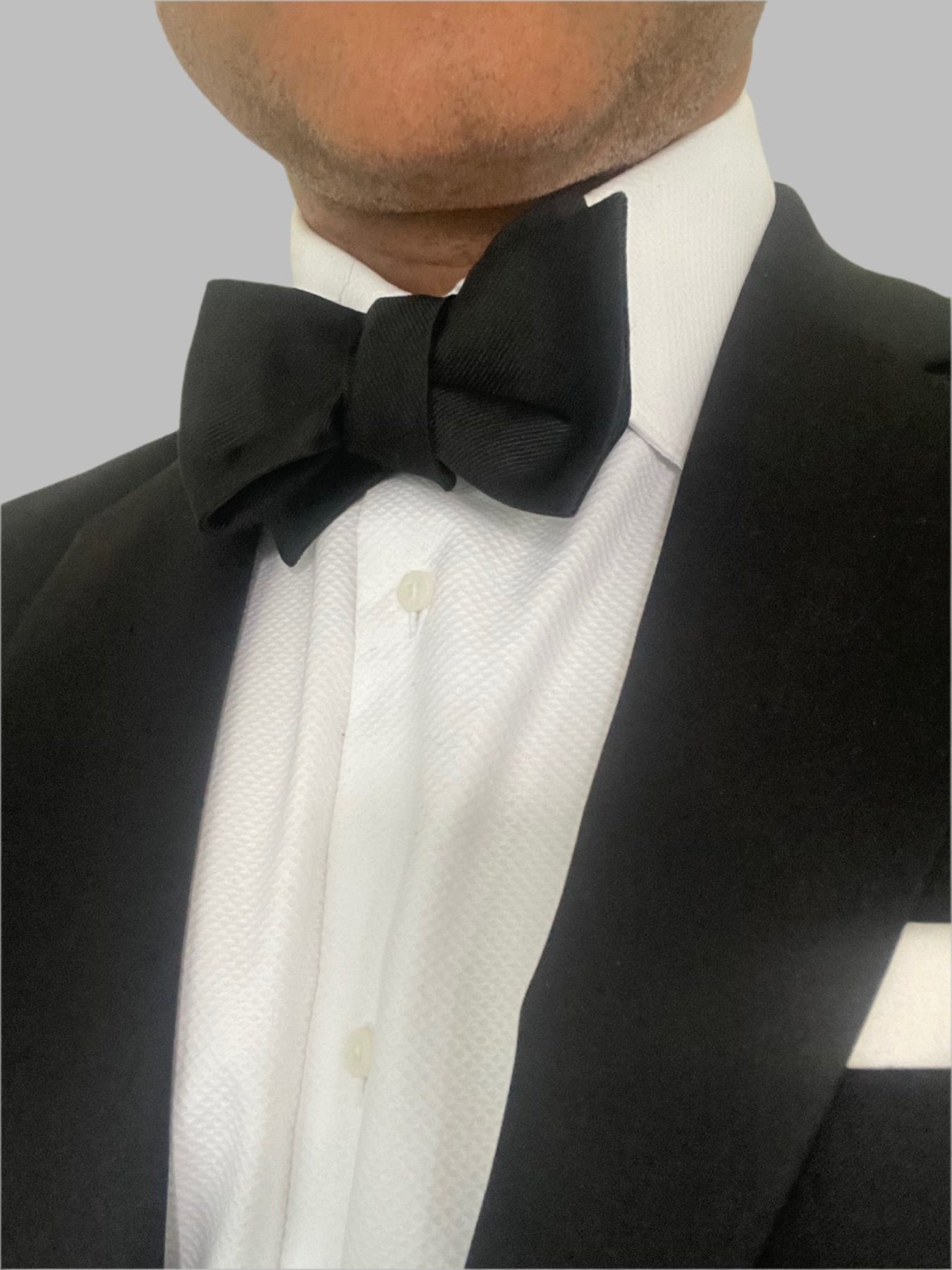 The Black Self-Tie Straight-End (aka Wide Batwing) Bowtie offers a bold yet refined statement with its distinctive wide shape. Crafted for a sophisticated look, this bowtie’s self-tie design allows for a perfect, customised fit. Ideal for formal occasions, it adds a touch of confident elegance to your ensemble.
