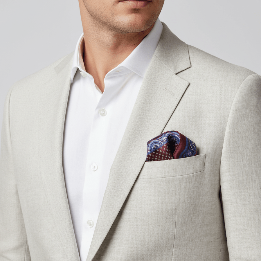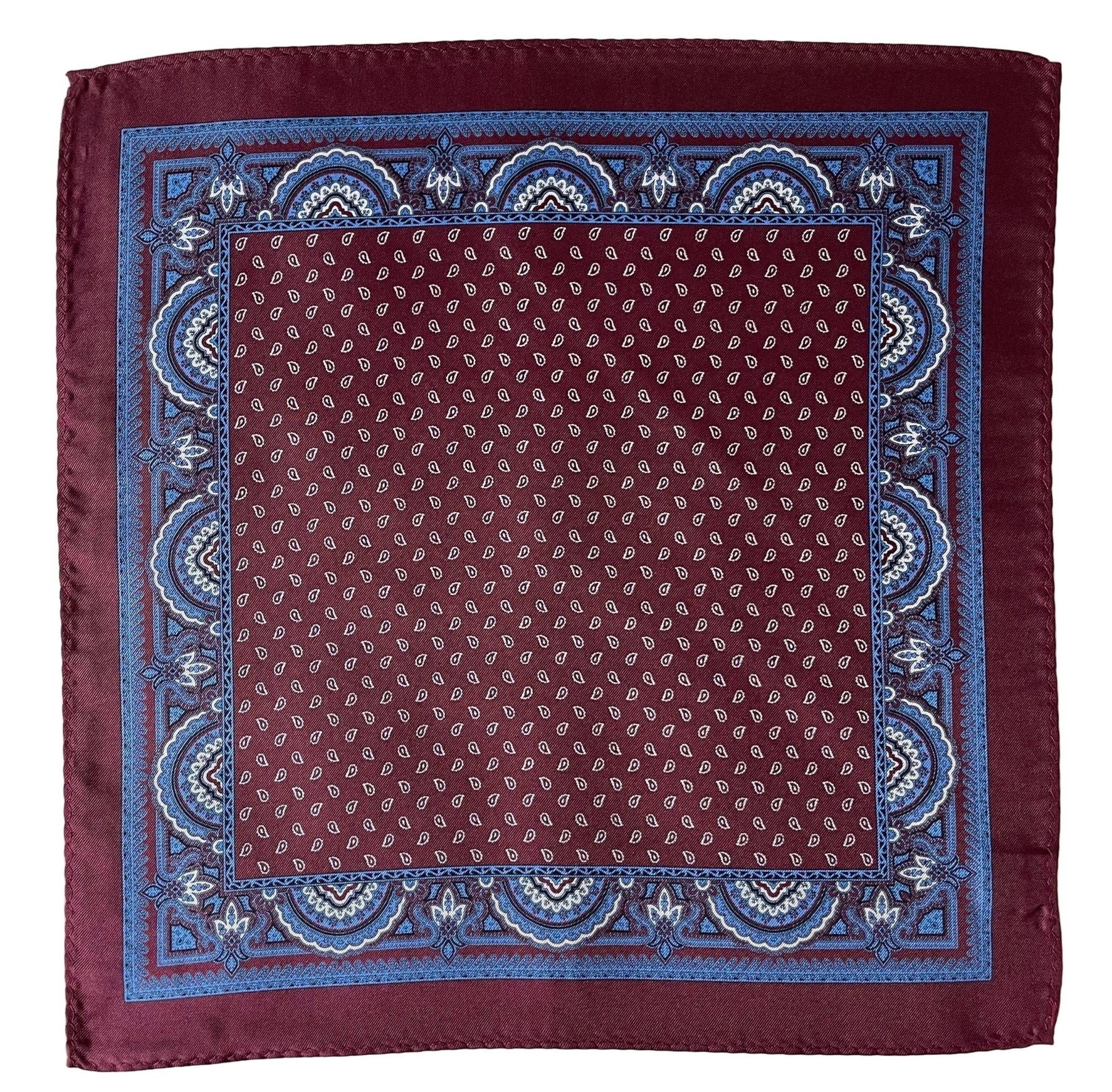 This pocket square features a densely patterned square with a strong central repeat and a defined decorative border. The layout is symmetrical and balanced, with the central field filled by a repeated paisley motif and the border providing a framed structure.