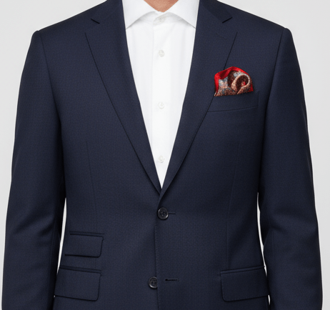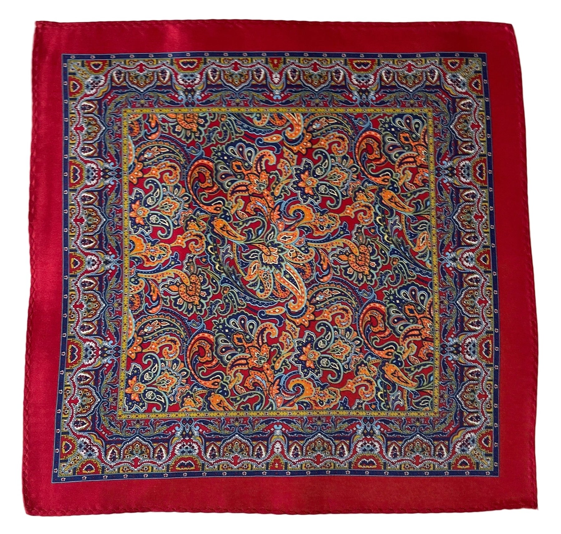 This pocket square showcases a rich paisley pattern densely packed within a defined border, finished with a solid red outer trim. Its symmetrical and seamless design offers a striking, ornate appearance from afar, unveiling intricate detailing upon closer inspection.