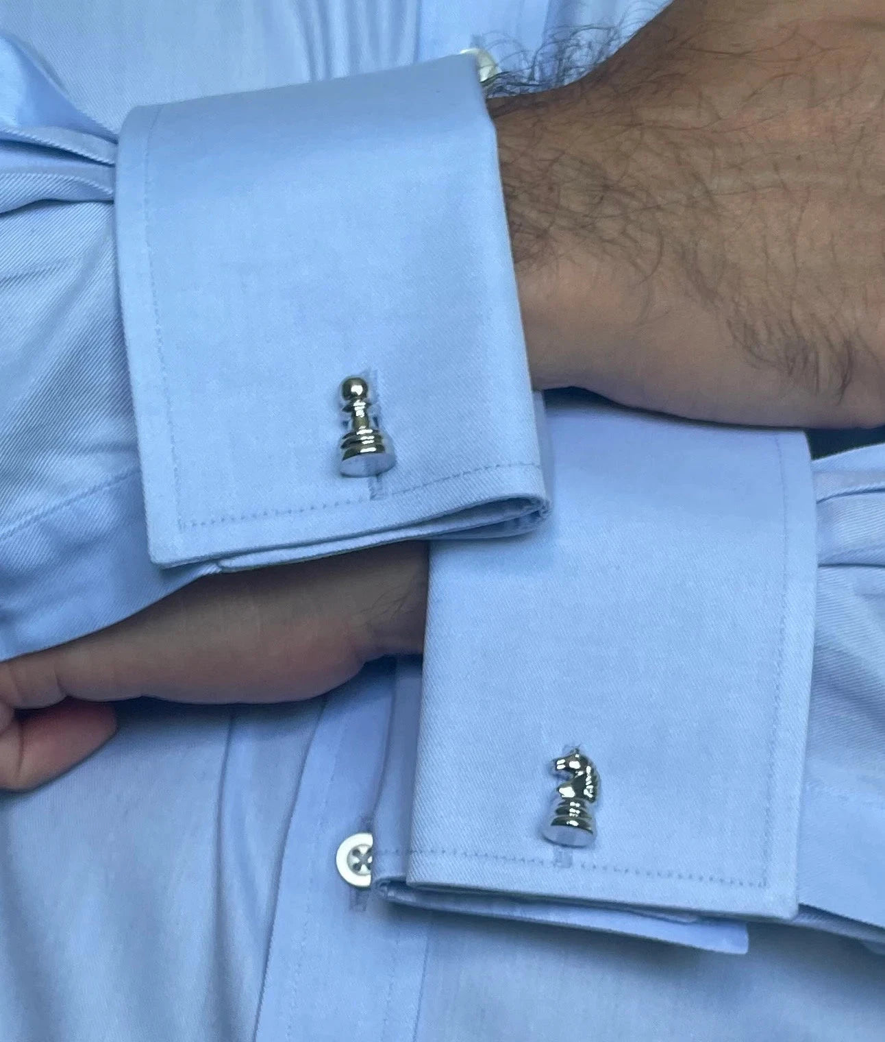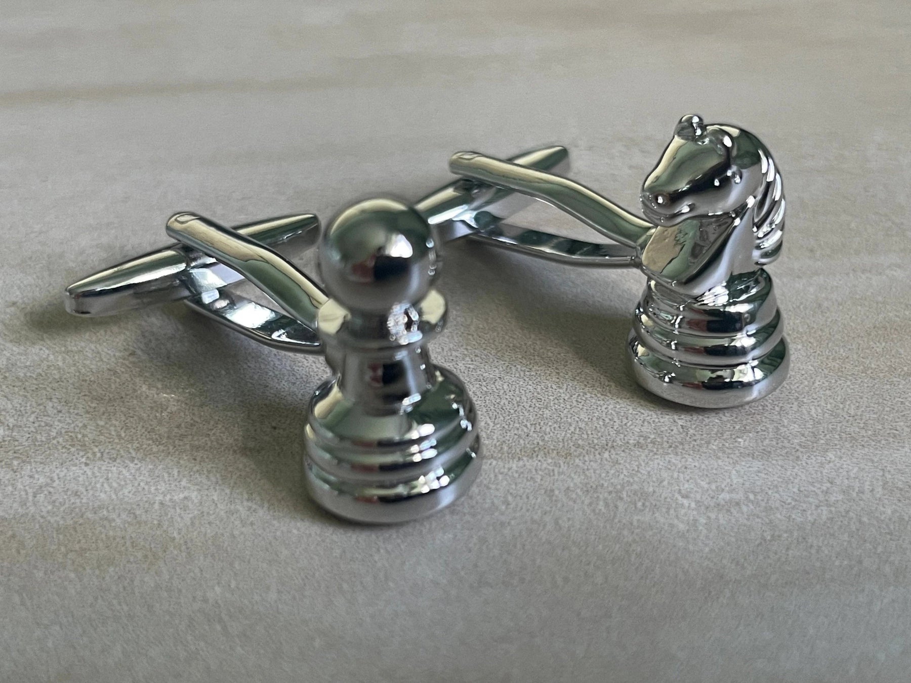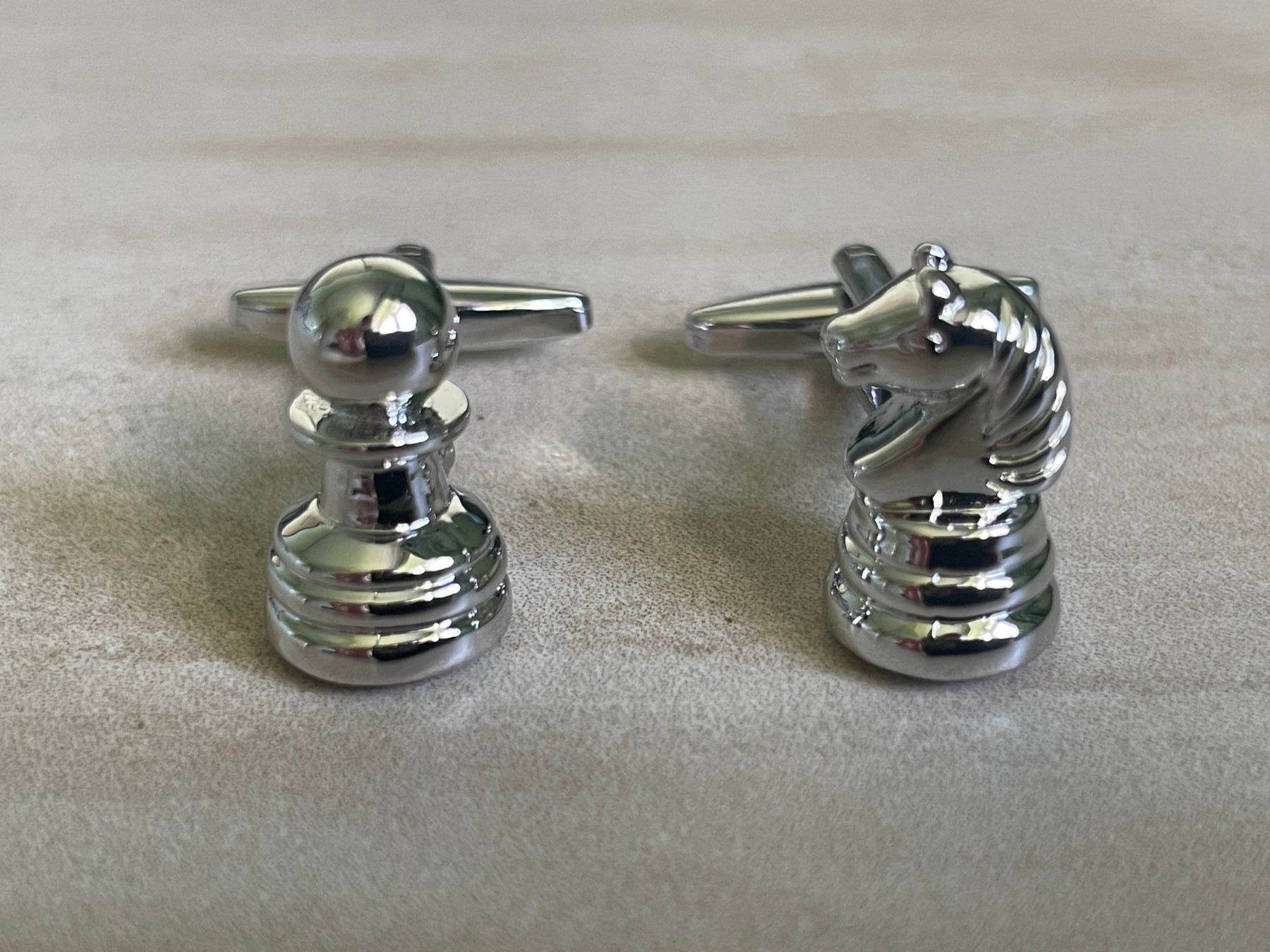 Knight takes pawn or pawn takes knight! These cufflinks are meant for the chess lover with a silver horse and pawn chess piece. With these beautiful chess piece cufflinks you're always one step ahead of the game!