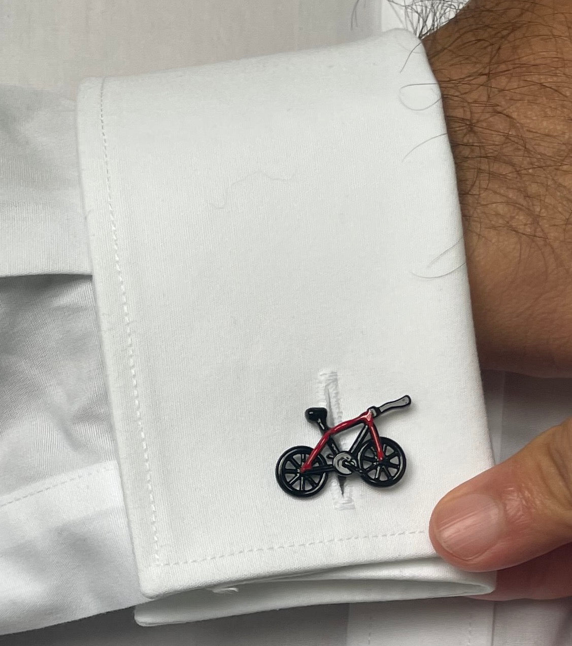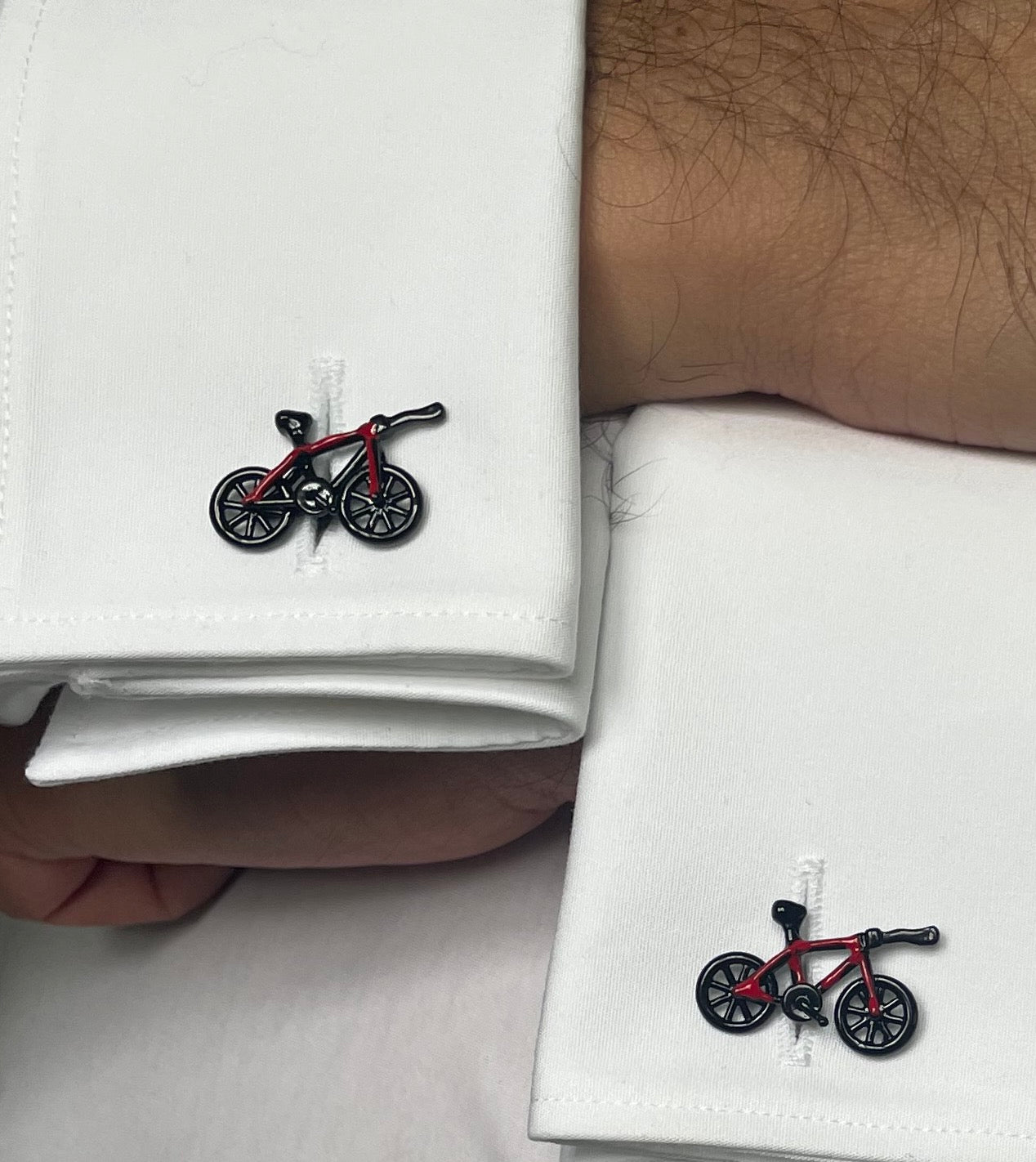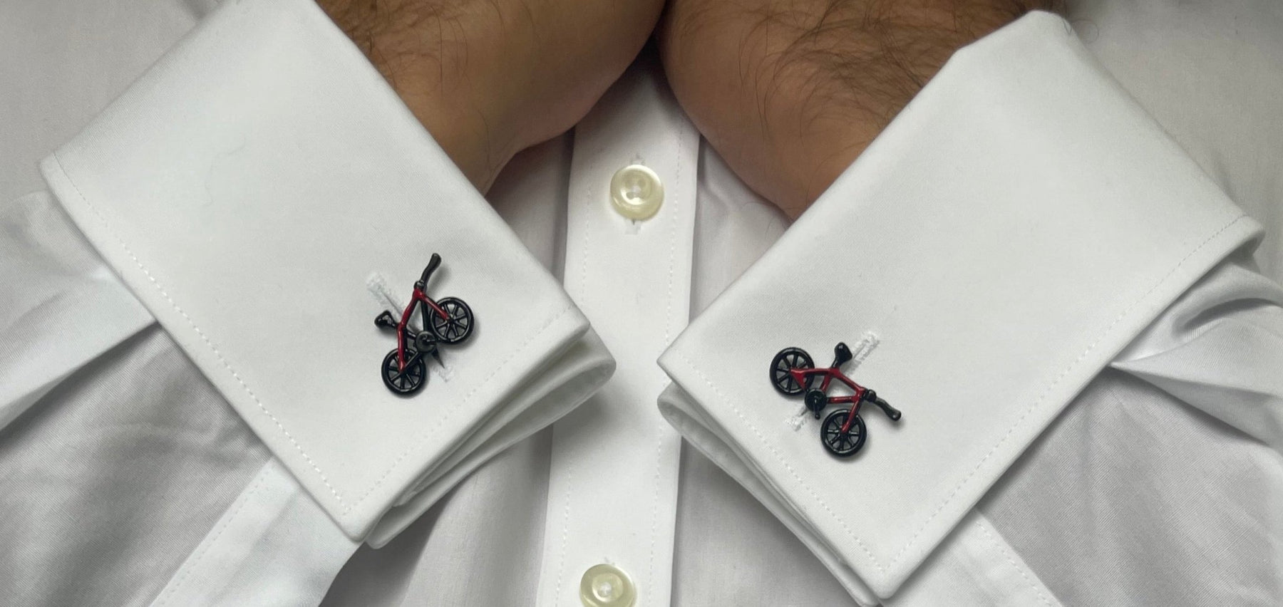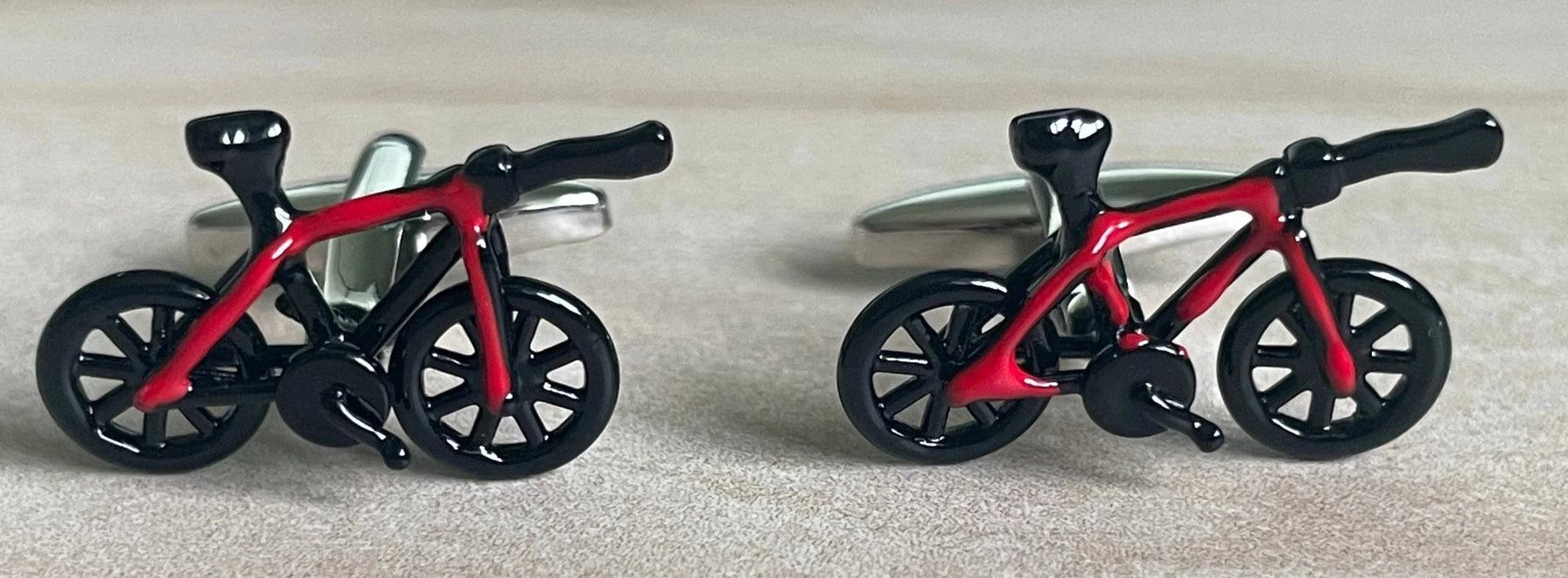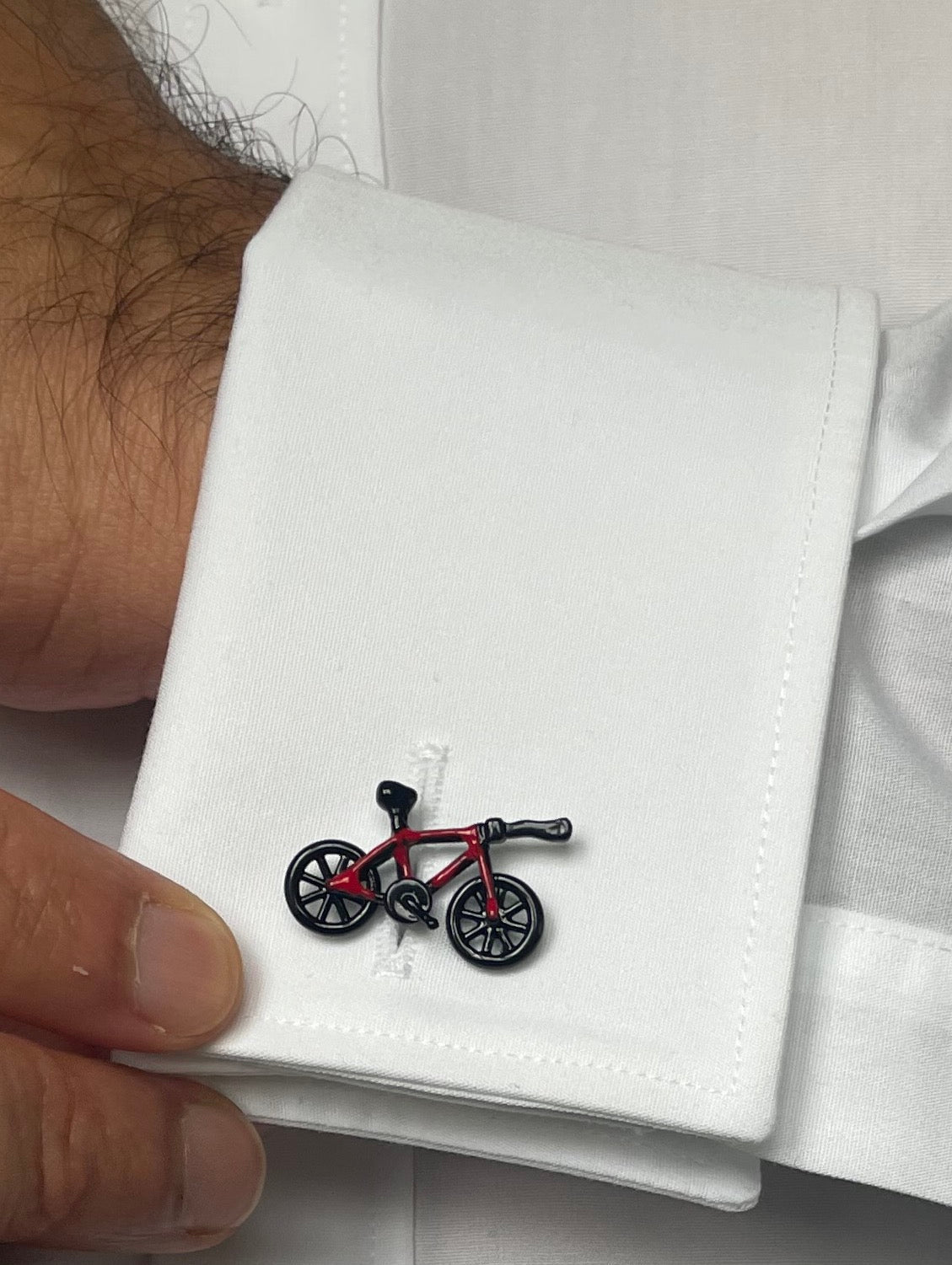 Add some speed to your style with these black and red racing bike cufflinks. Perfect for the cyclist in your life, these cufflinks are a playful and unique addition to any suit or dress shirt. Don't be afraid to rev up your fashion game with these quirky cufflinks!