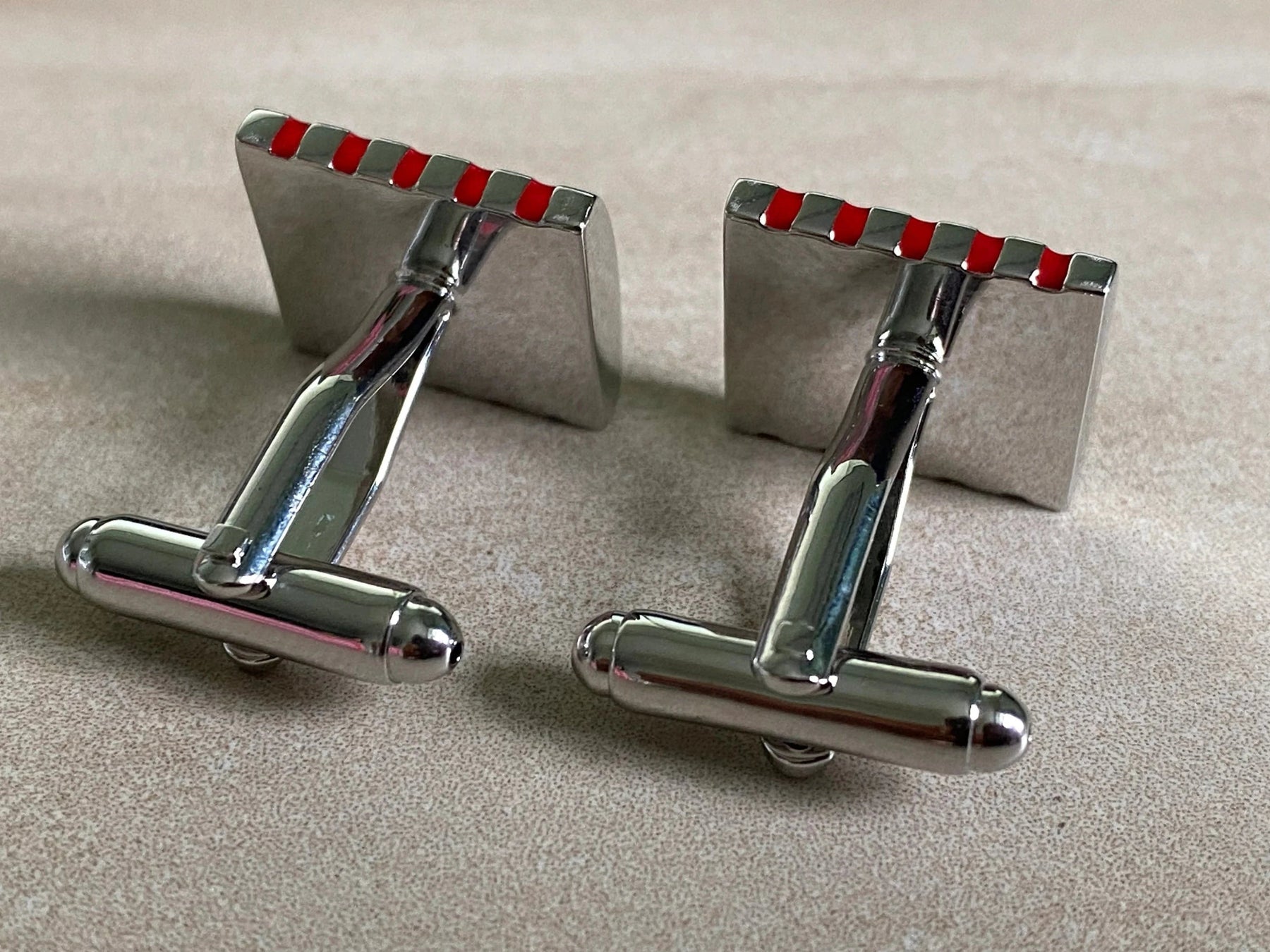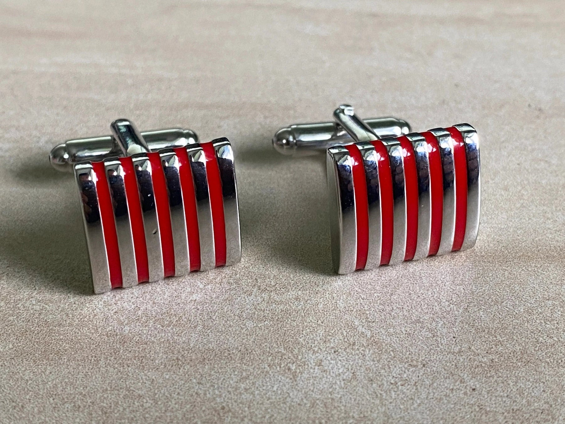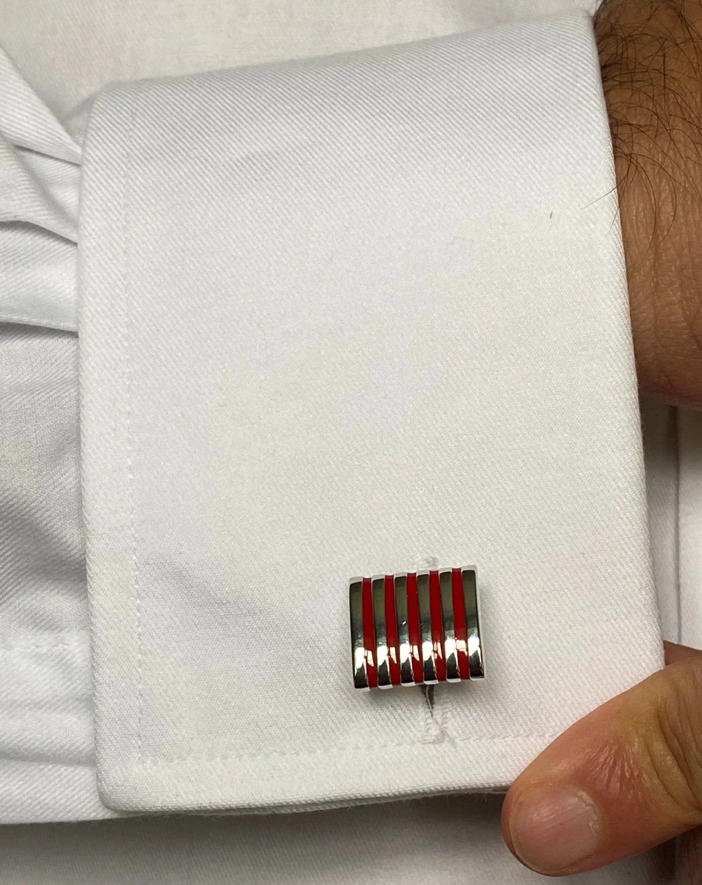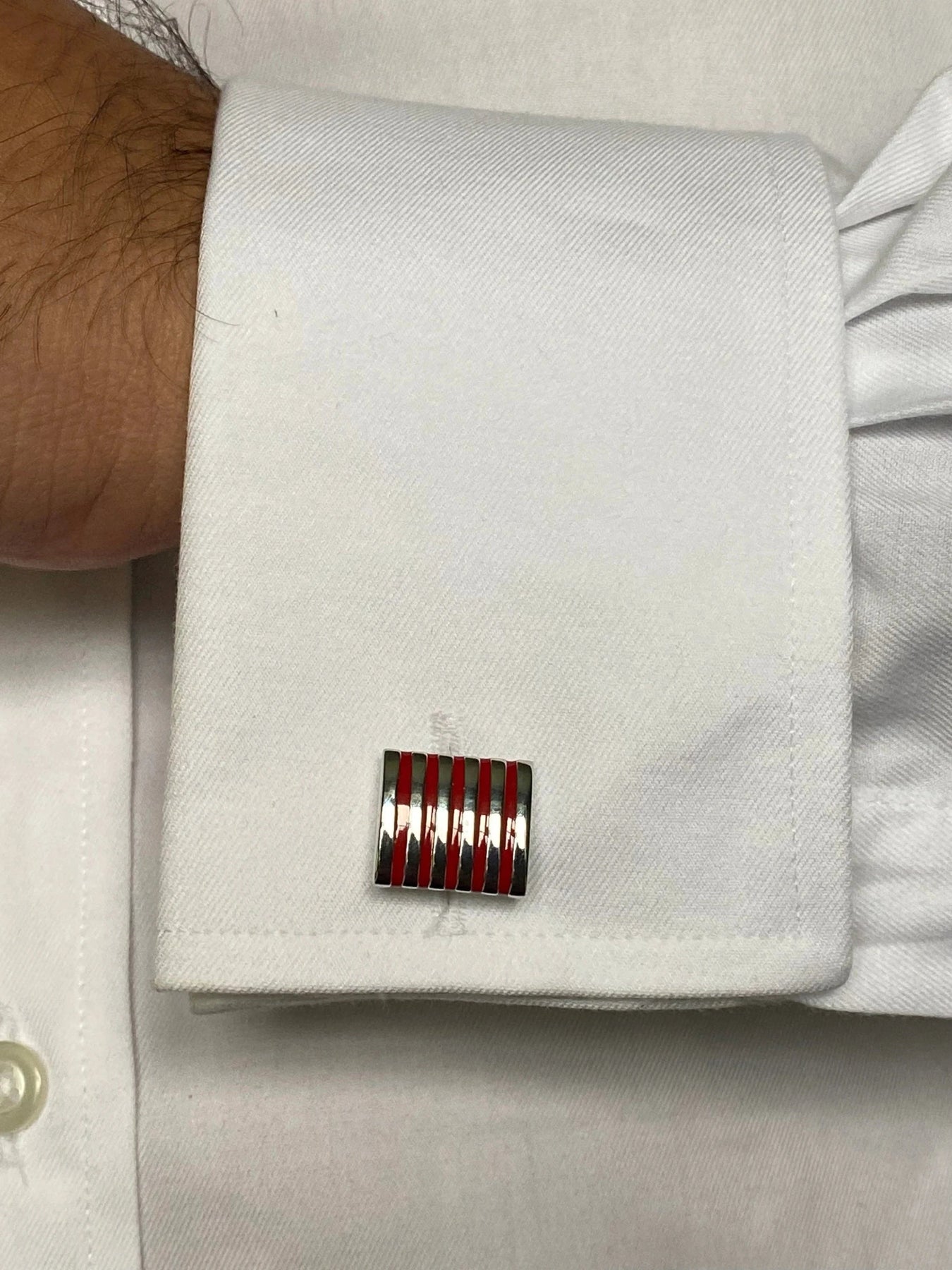 Step up your style game with these red and silver smart cufflinks! Perfect for any occasion, they will add a pop of color and sophistication to any outfit. Be the envy of everyone in the room with these sleek and stylish square cufflinks. Upgrade your look today!