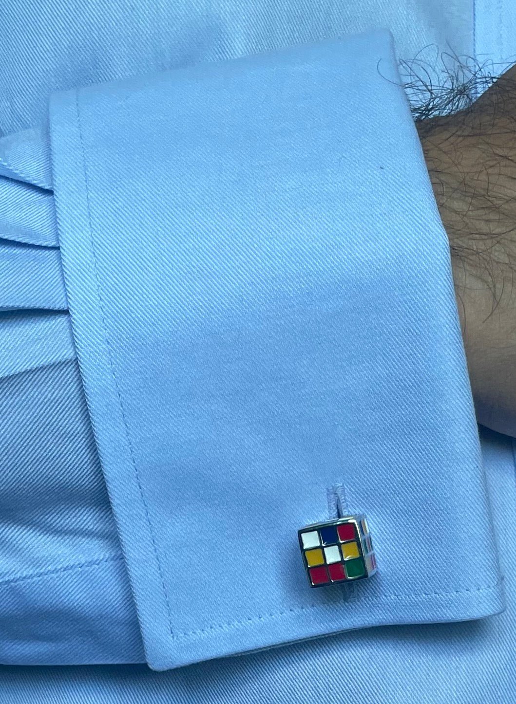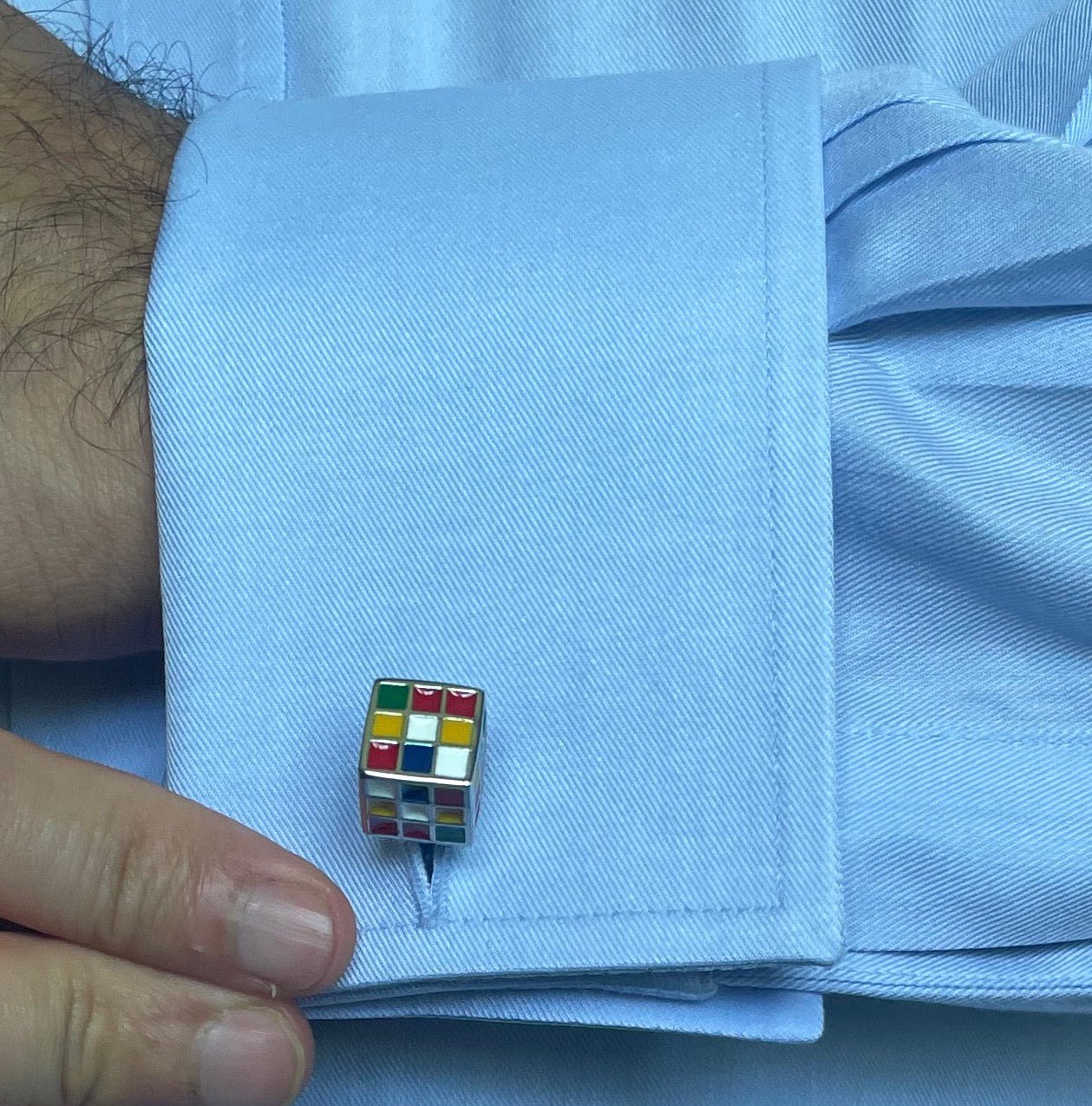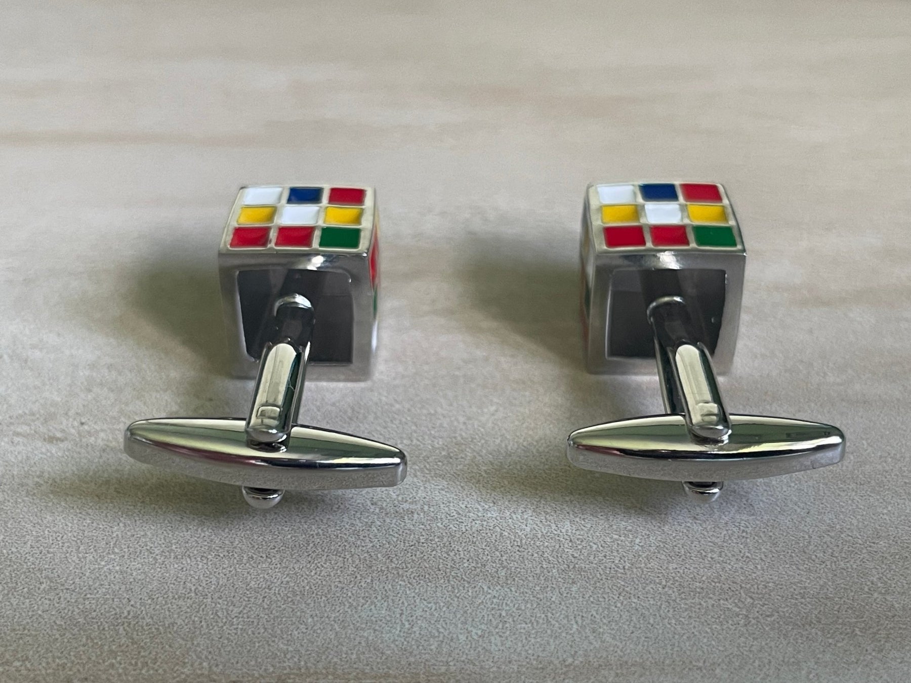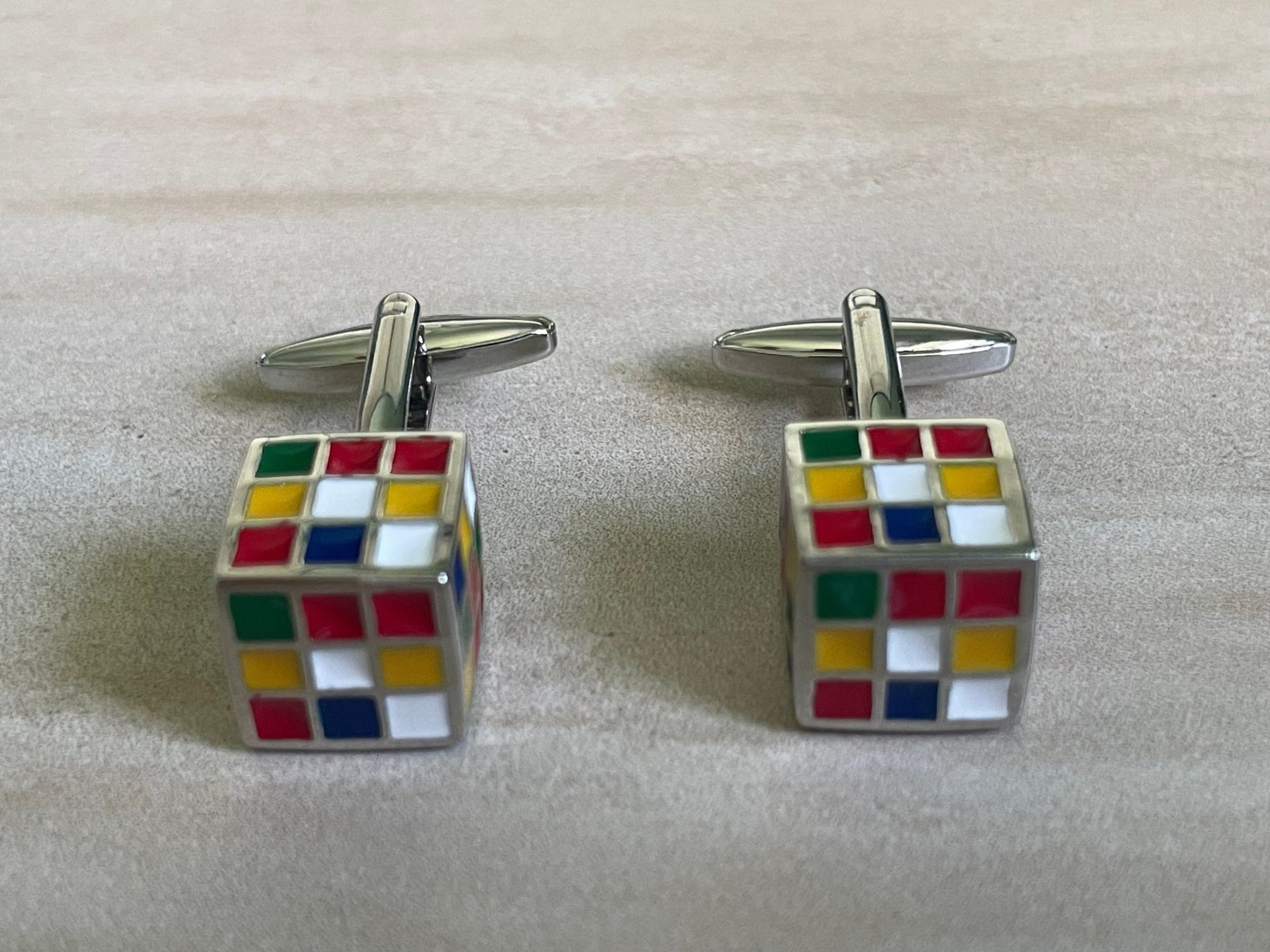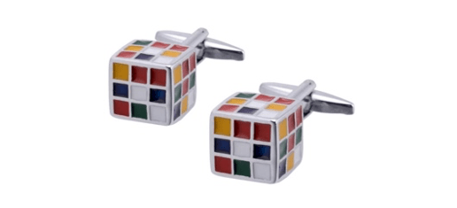 These cufflinks picture the Rubik's cube in retro seventies colours.