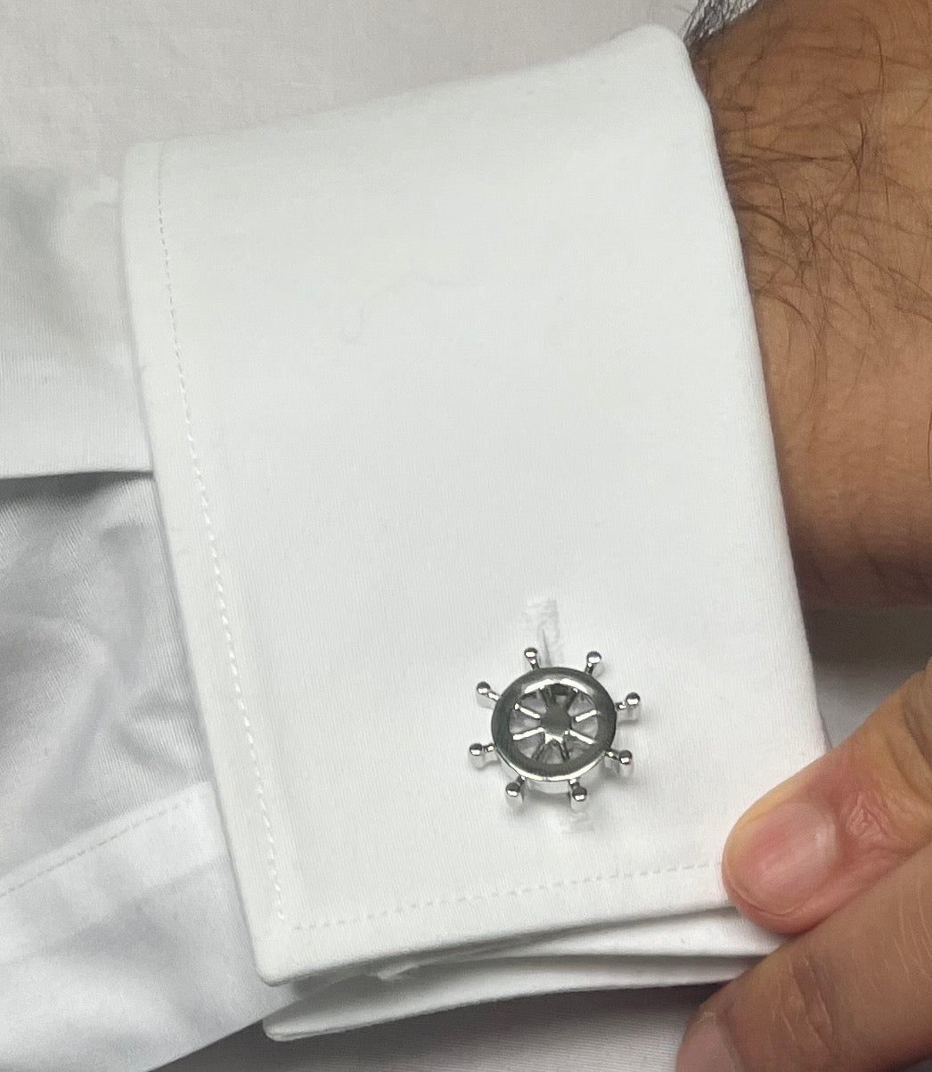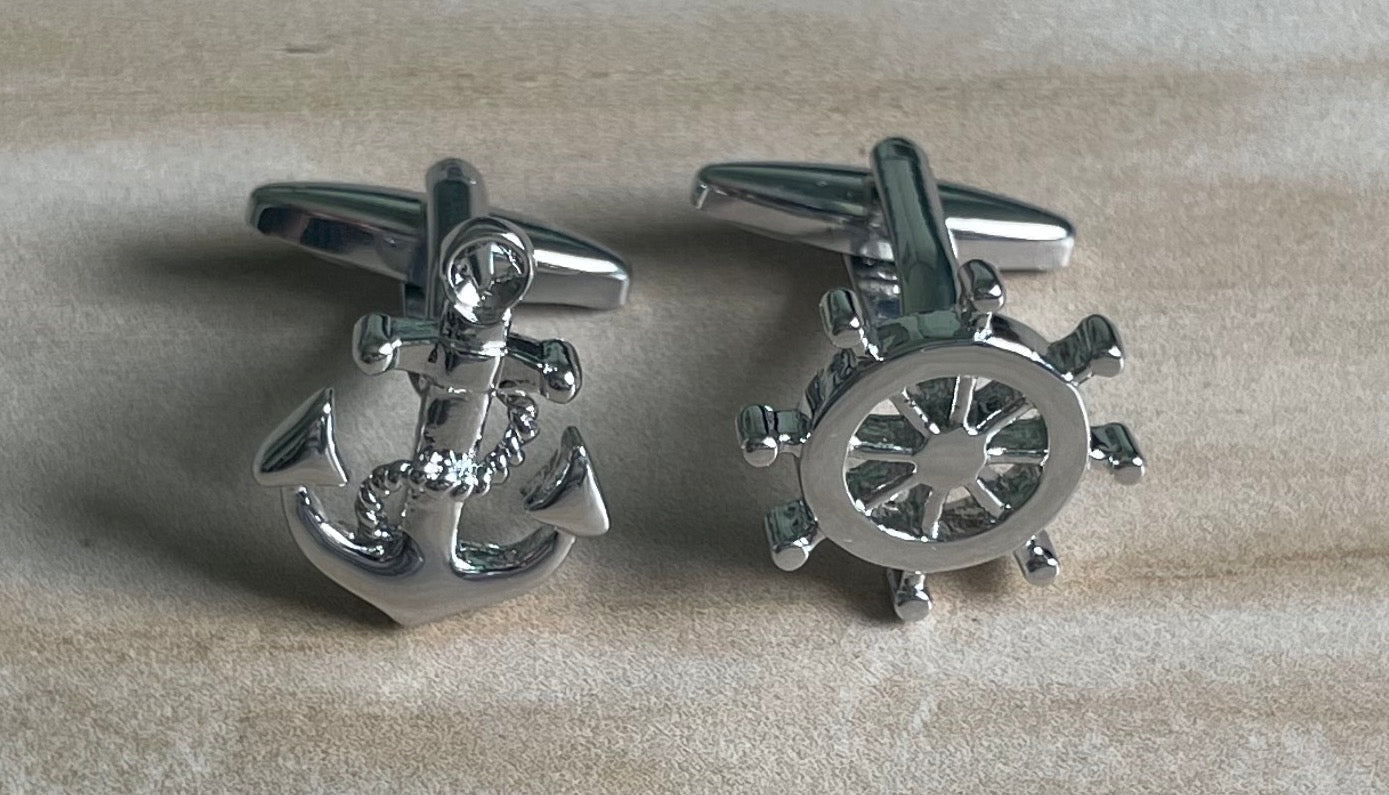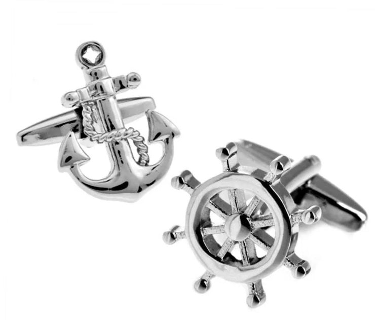 Add some nautical charm to your wardrobe with these Silver Anchor and Helm cufflinks. Perfect for any sea lover, these cufflinks are sure to add a unique touch to any outfit. Sail away with style and stand out from the crowd!