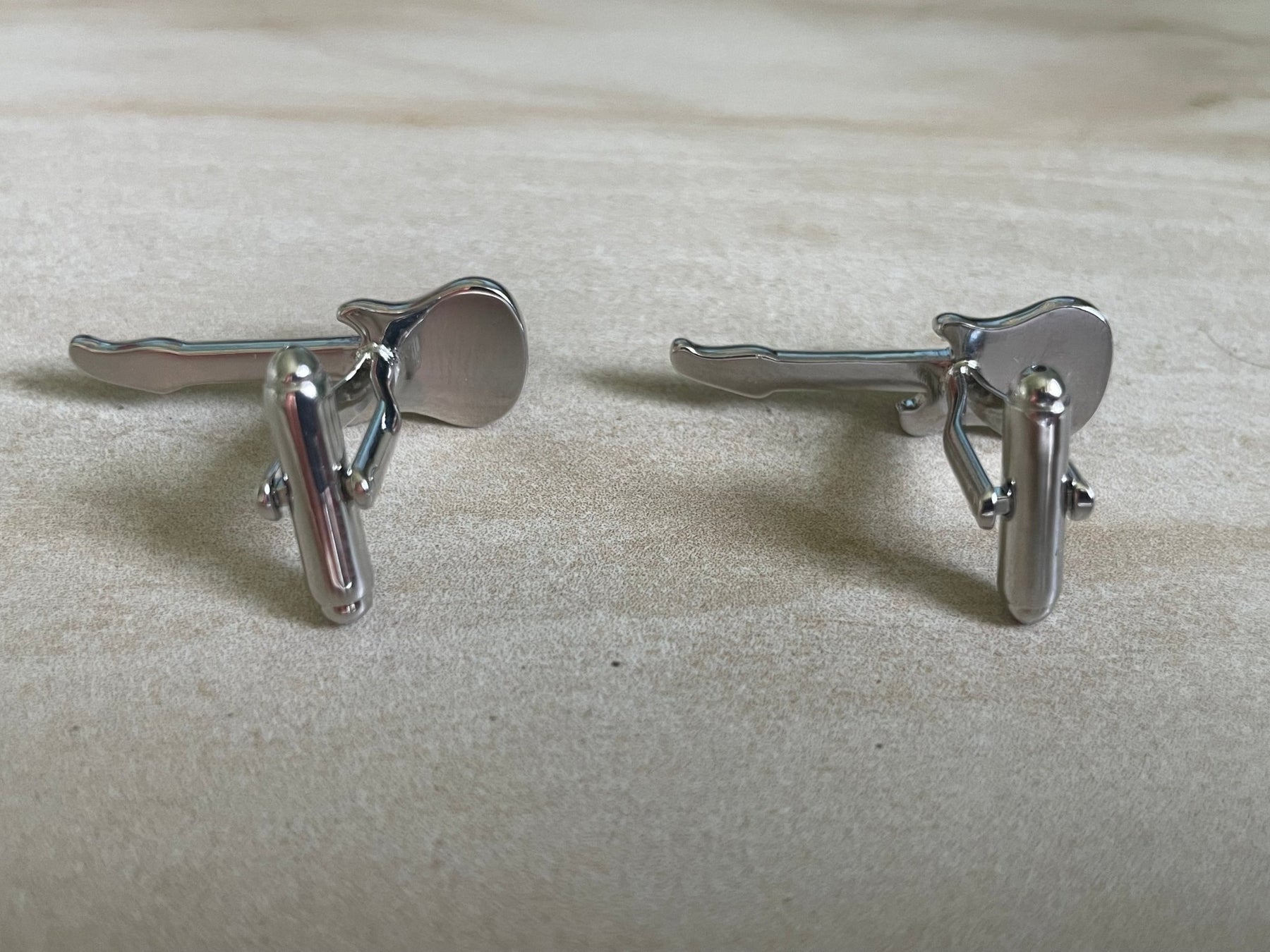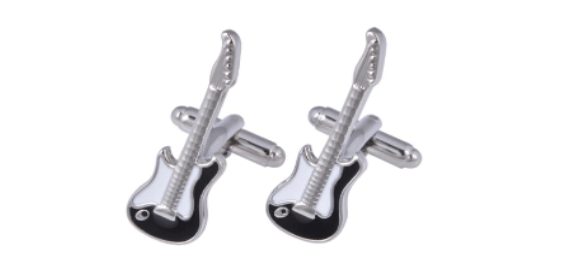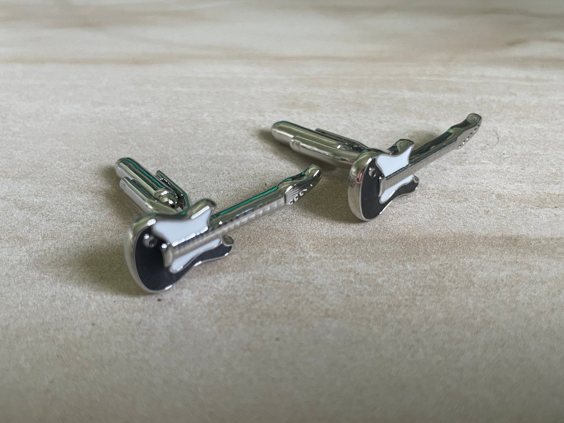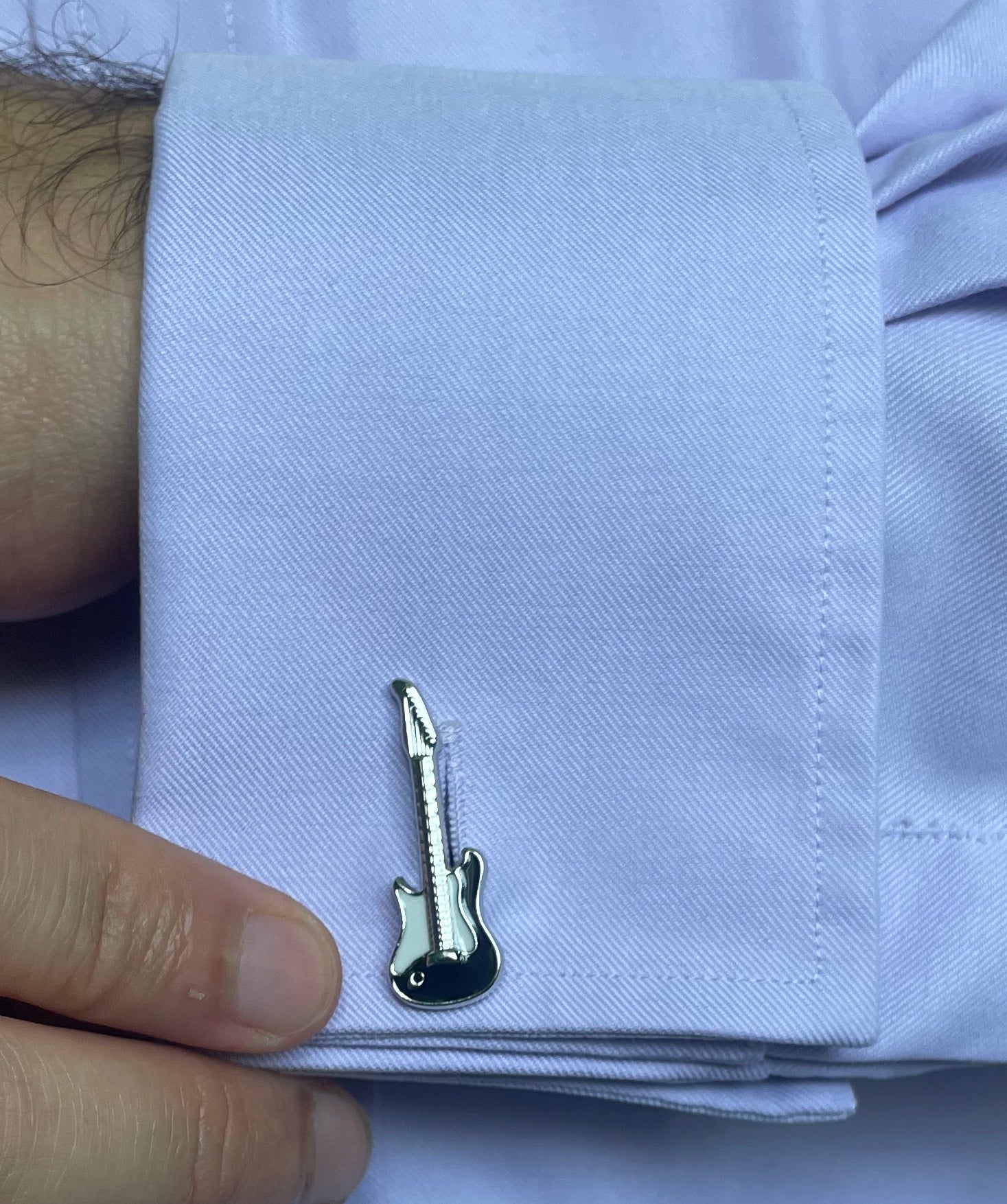 Picture Brian Johnson, Jimmy Page, Jimi Hendrix, Eric Clapton and other guitar legends and you will have that Rock God feeling with these rocking pair of Fender electric guitar cufflinks. Silver plated classic Fender electric guitar design cufflinks with great detail of classic black and white guitar. Great gift for music fans, guitarist or a gift for men who love electric guitar music.