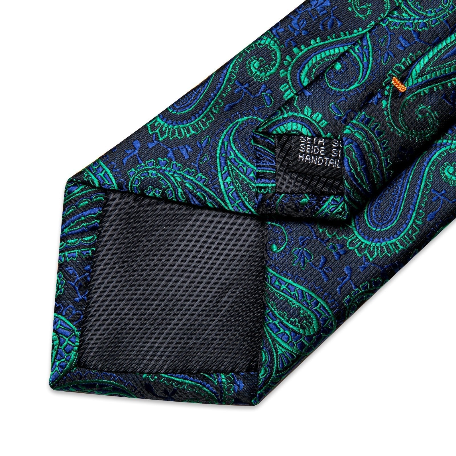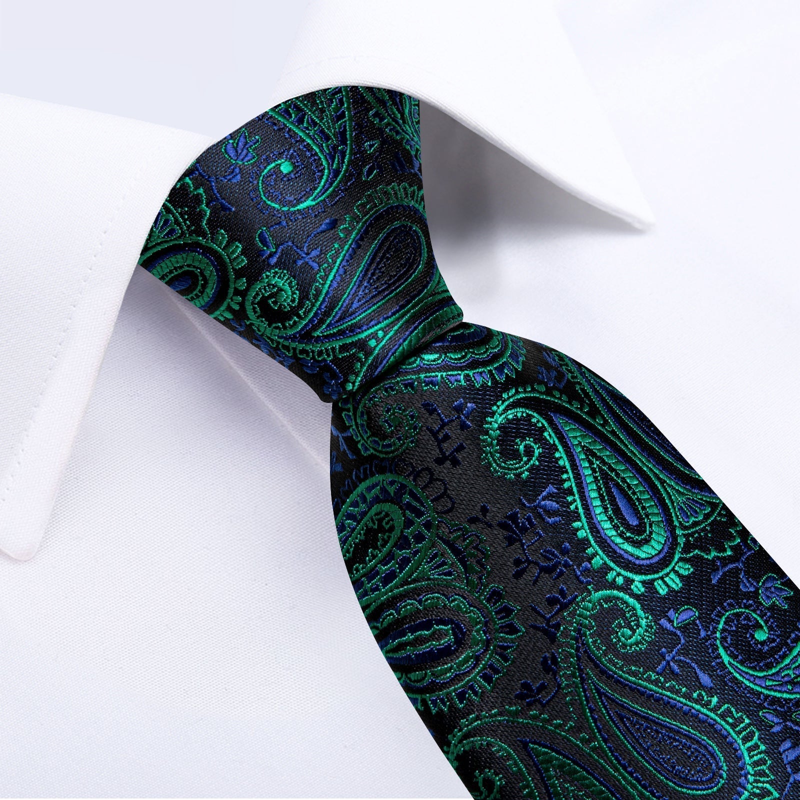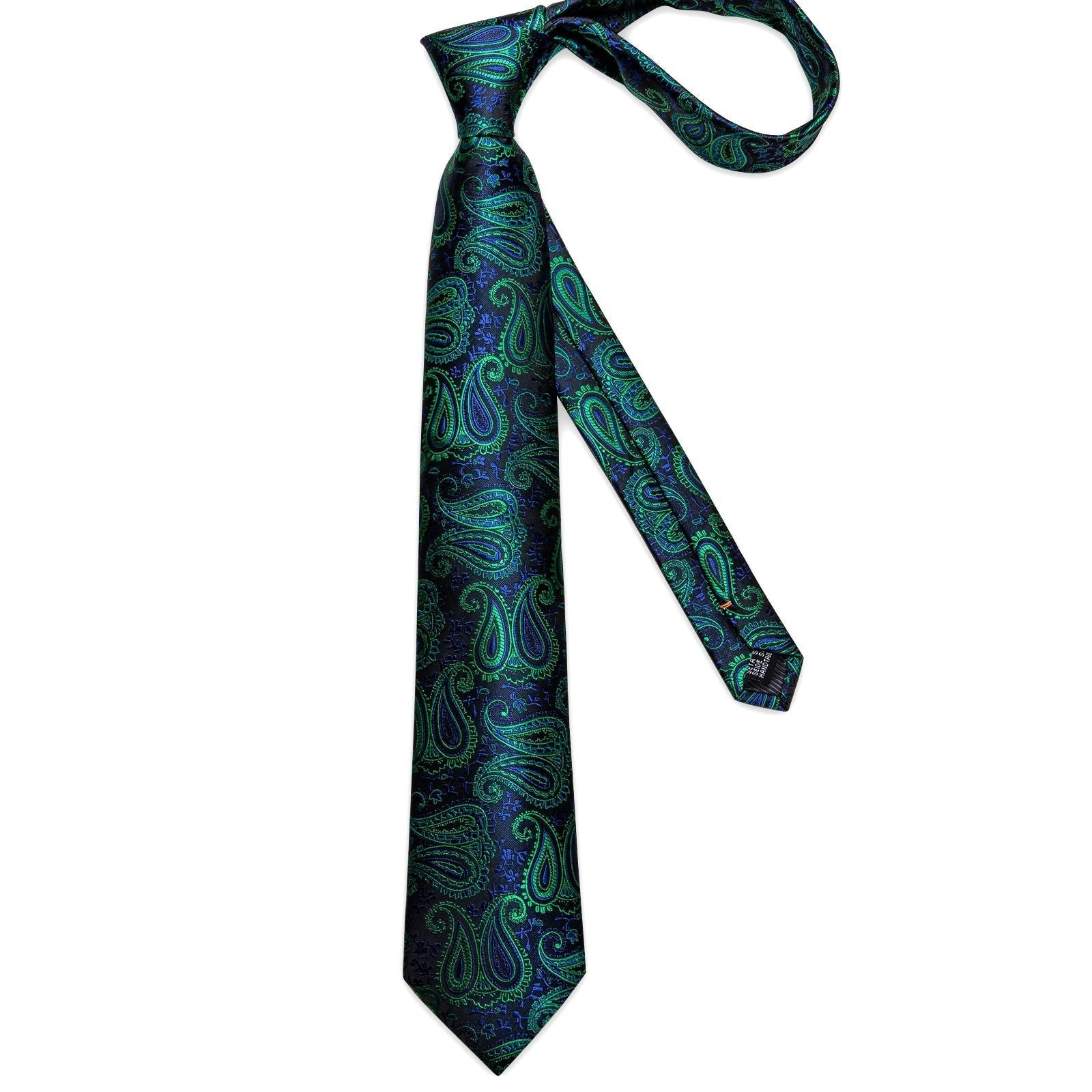 Dapper Essentials presents a meticulously designed silk tie showcasing an elegant paisley pattern in shades of dark blue, navy, and green.