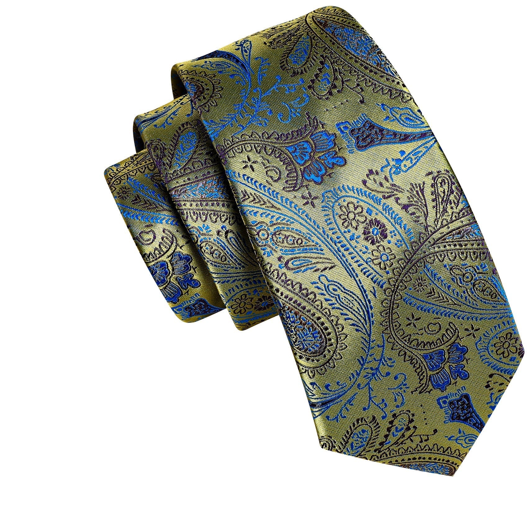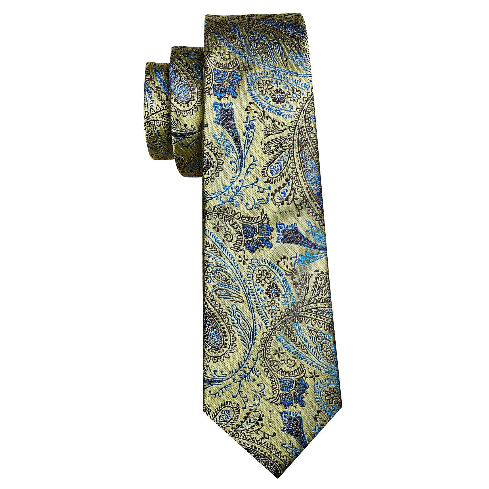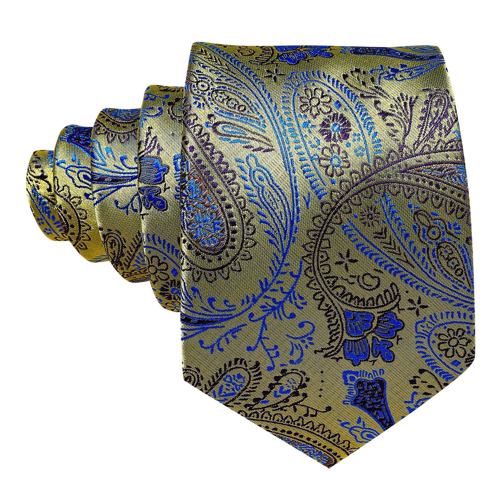 Dapper Essentials offers a finely crafted silk tie featuring a sophisticated paisley design in gold, light blue, and black.