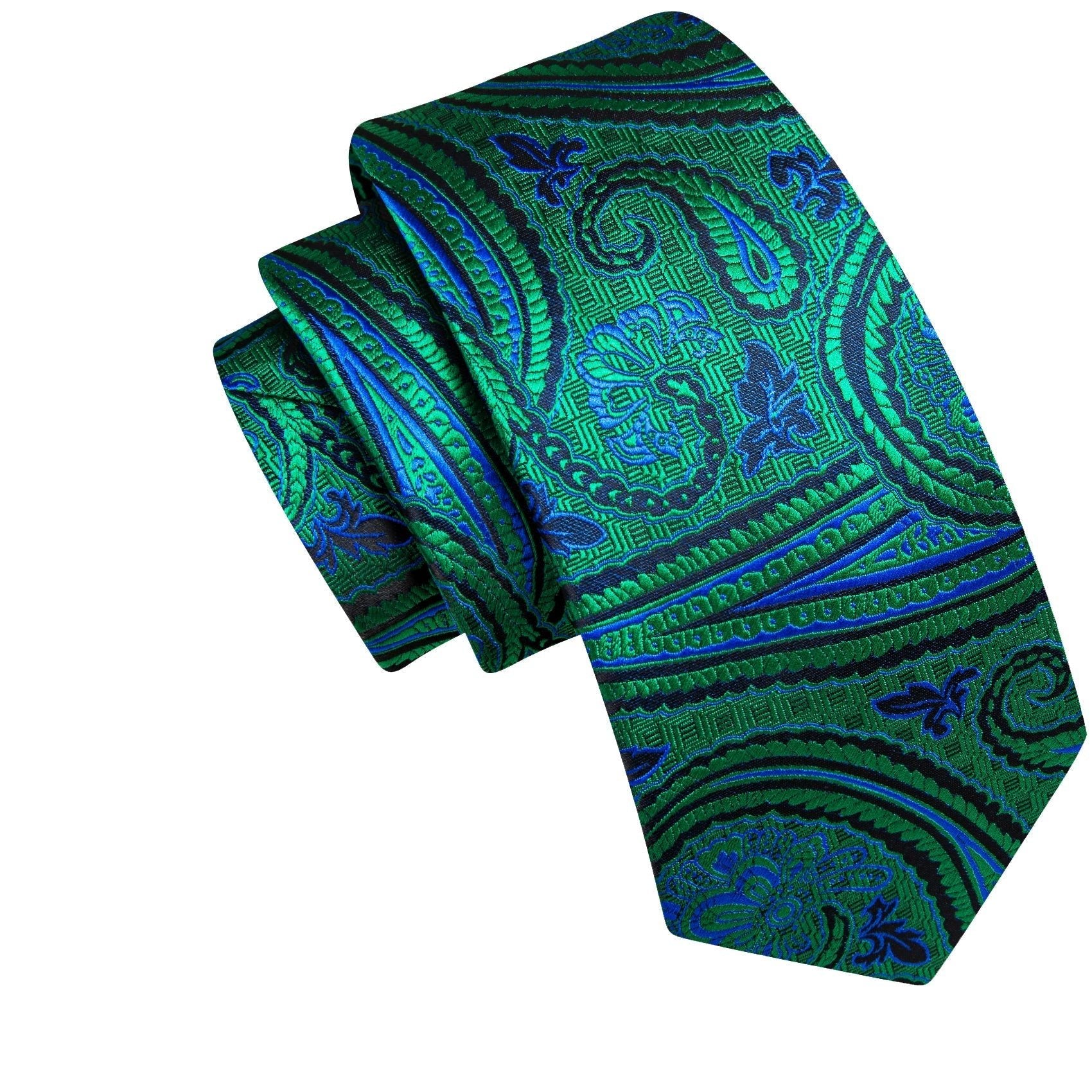 Dapper Essentials offers a finely crafted silk tie featuring a sophisticated paisley design in shades of green, blue, and navy.