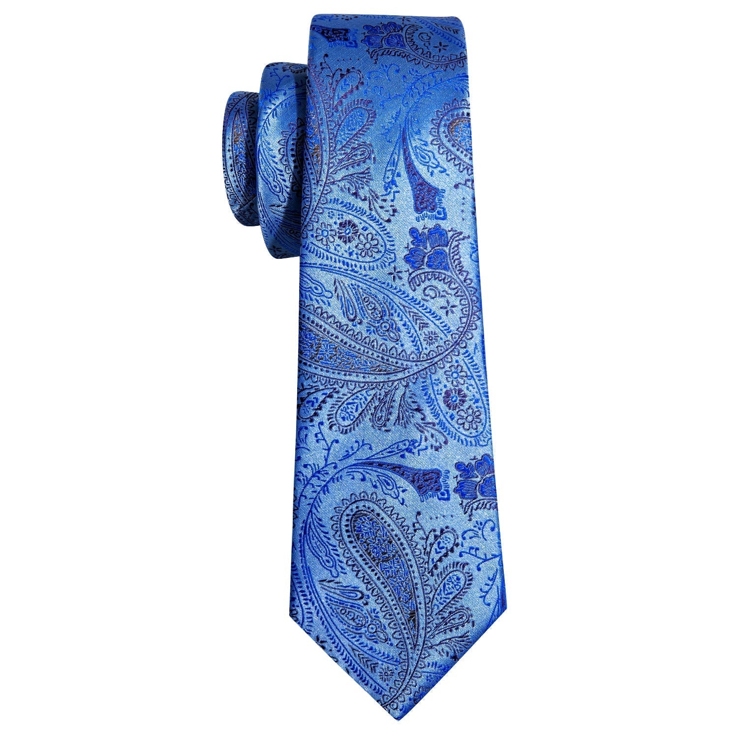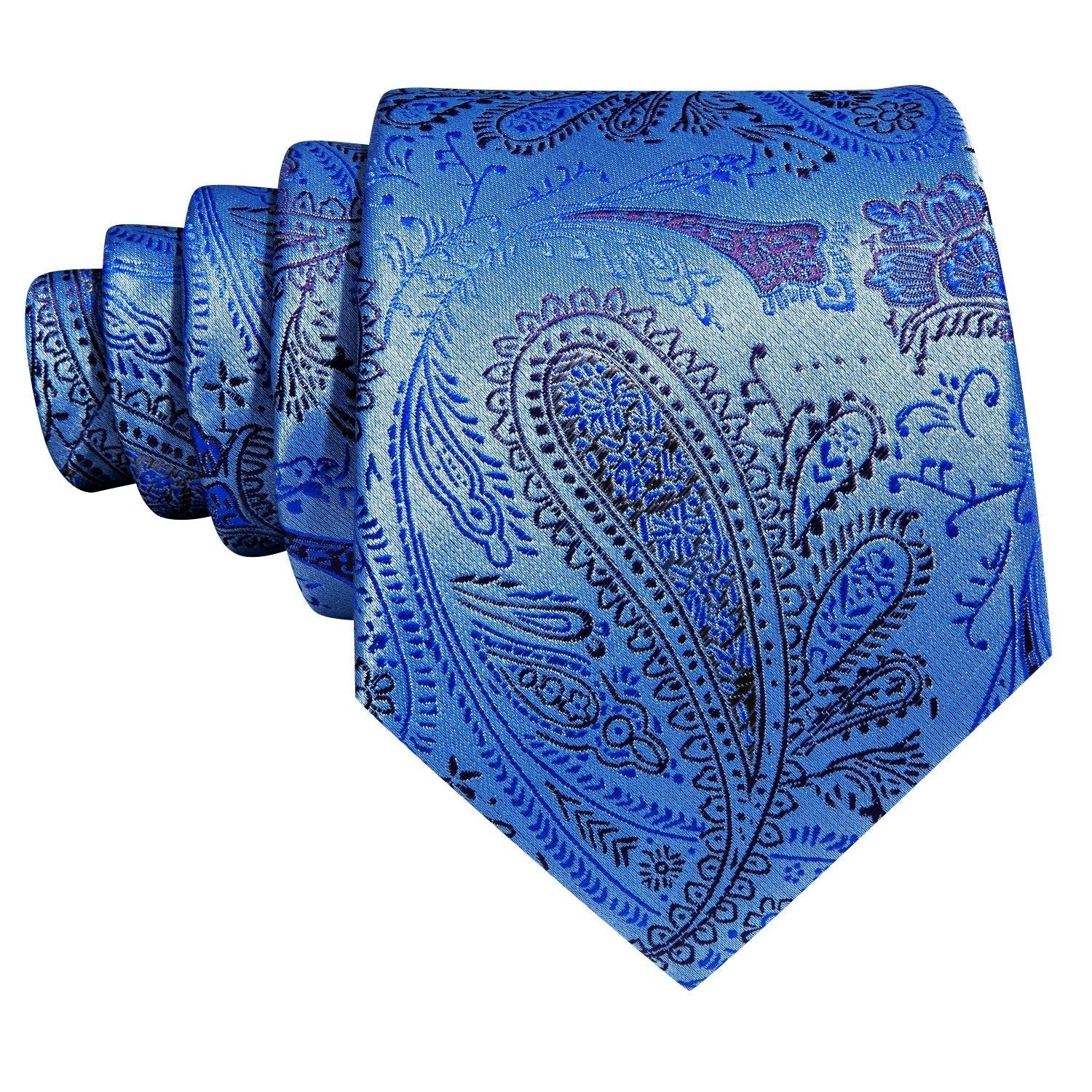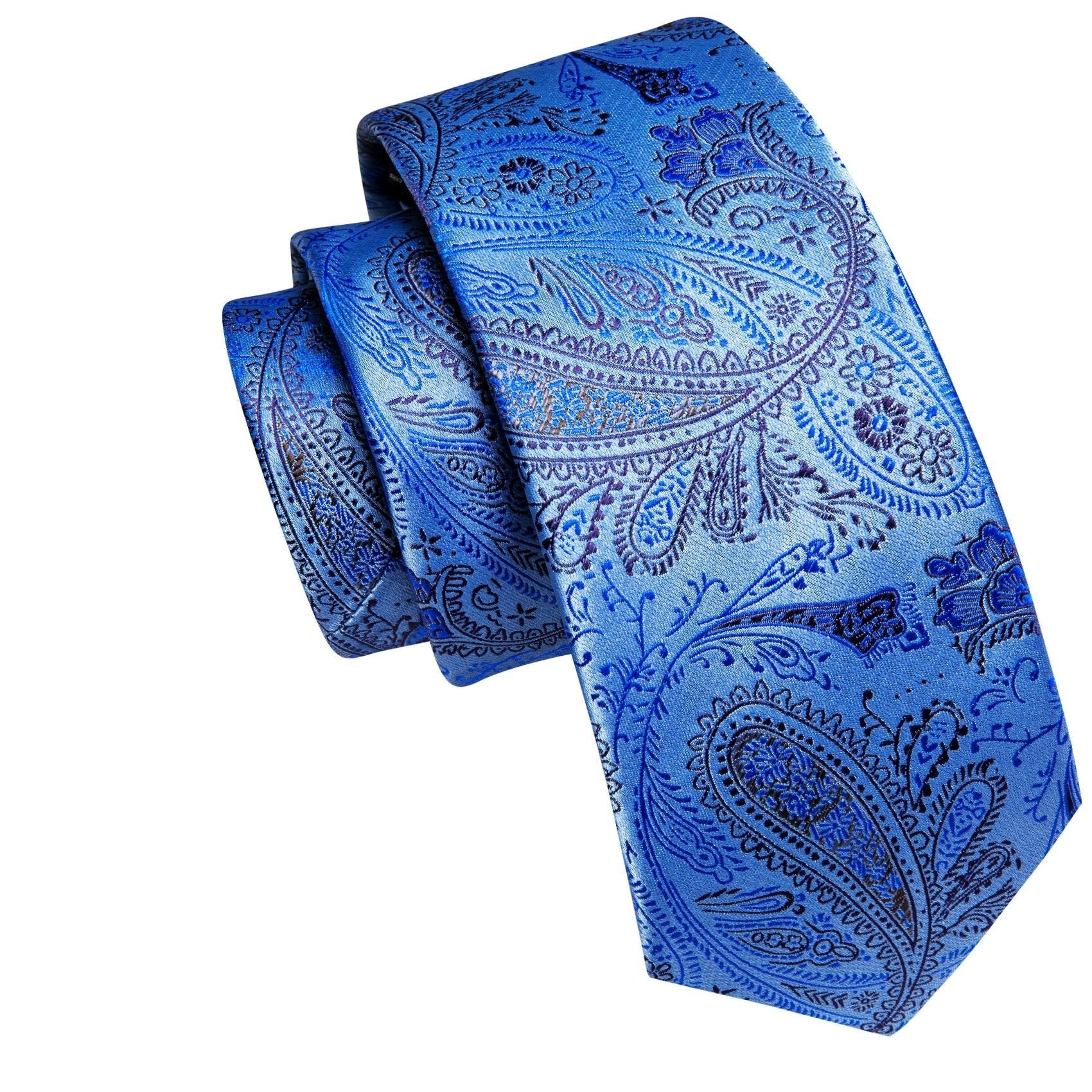 Dapper Essentials introduces a finely crafted silk tie featuring a sophisticated paisley design in shades of light blue, navy, and black.