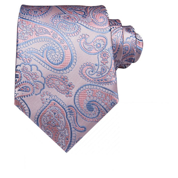 Dapper Essentials offers a finely crafted silk tie featuring a sophisticated paisley design in shades of lavender grey, light blue, and dusty mauve.