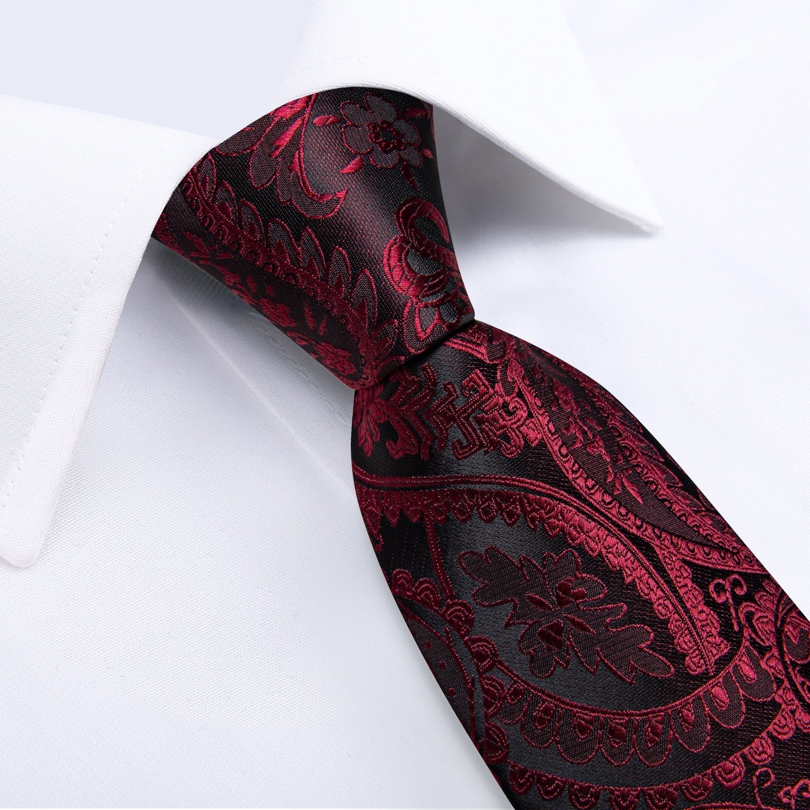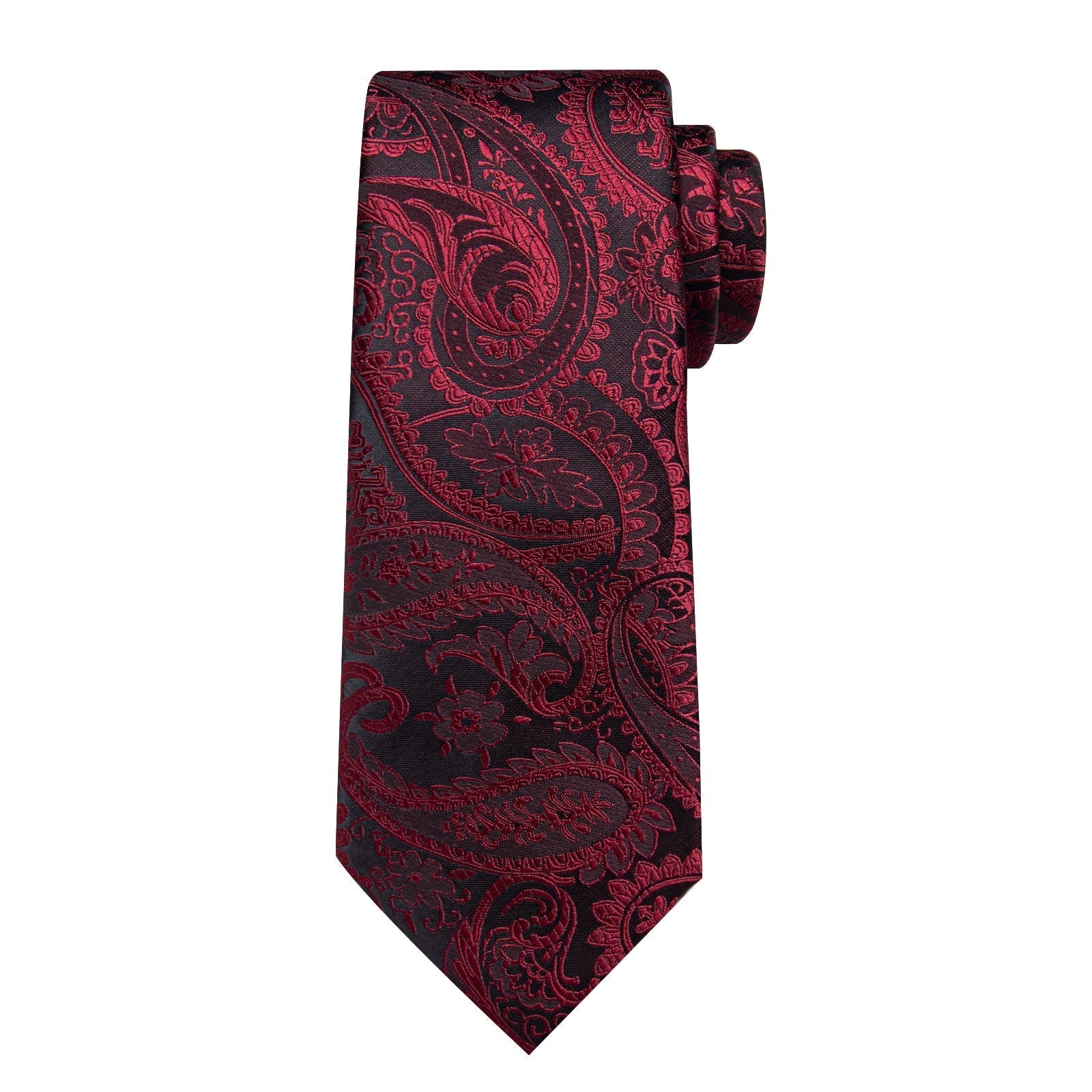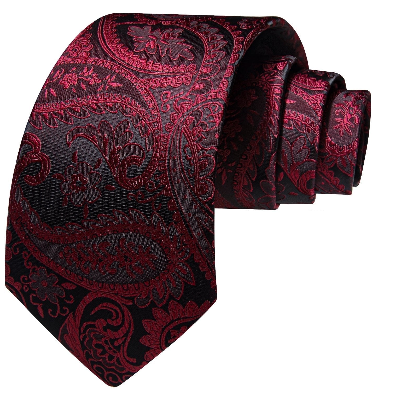 Dapper Essentials offers a meticulously crafted tie made from woven silk, featuring a sophisticated red and black paisley design.