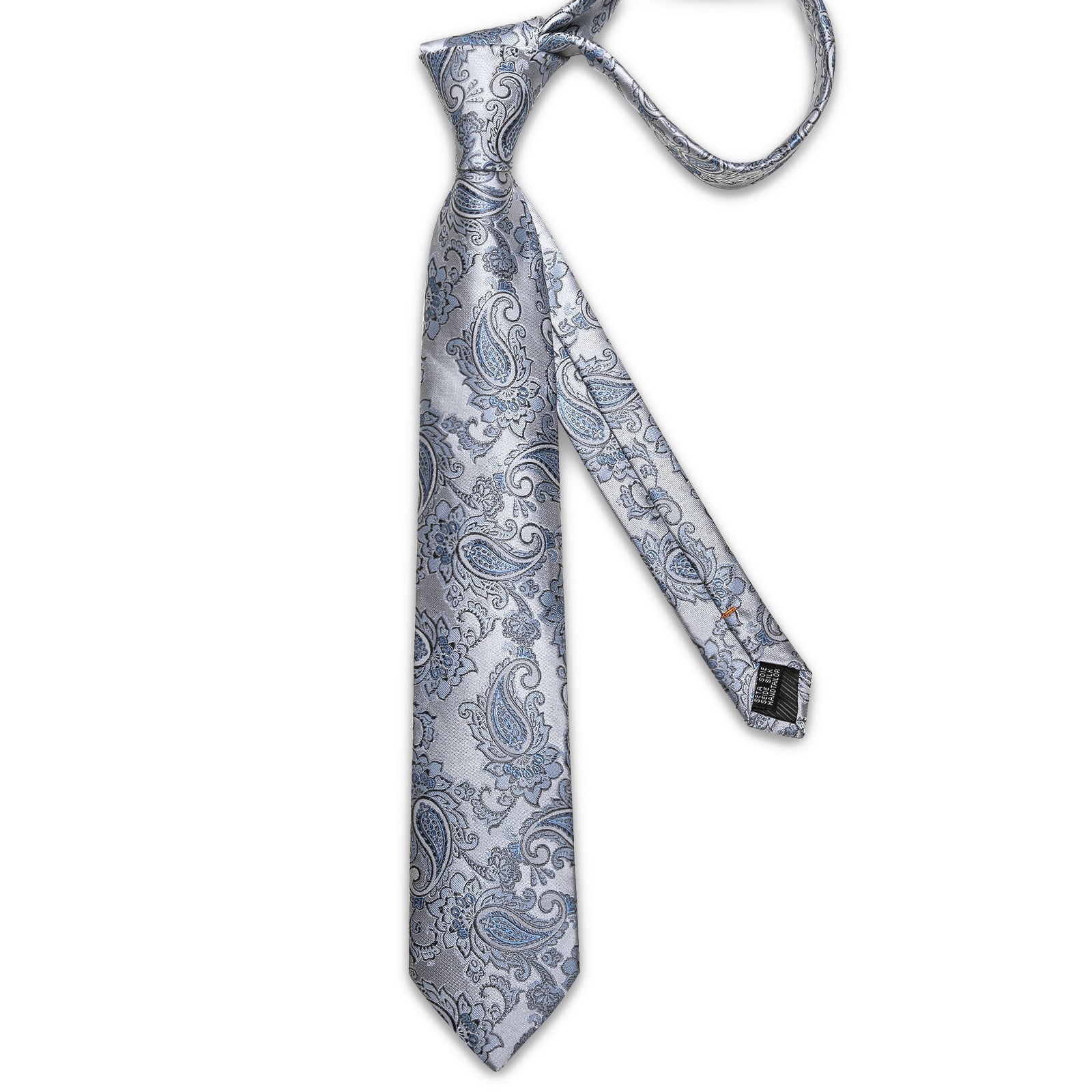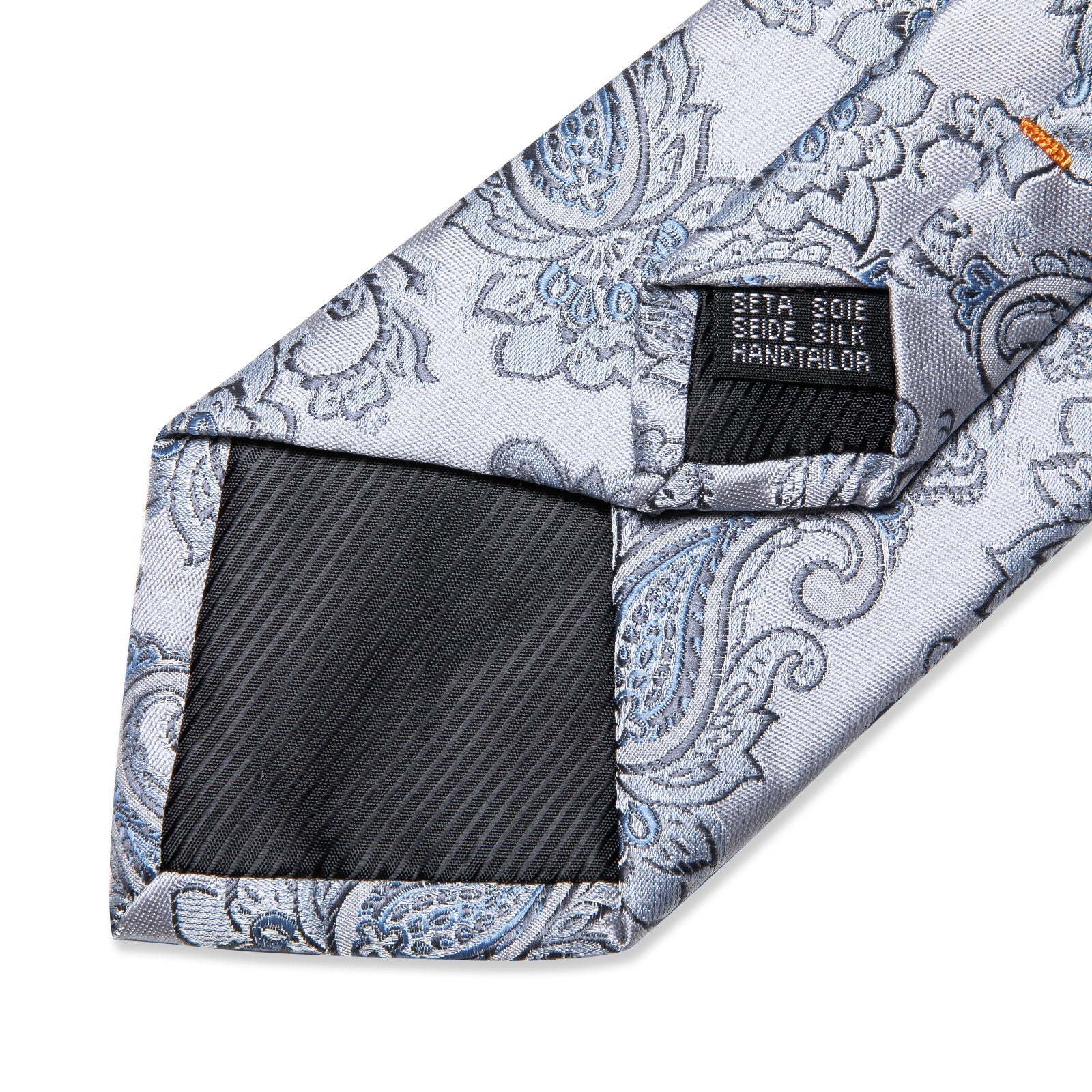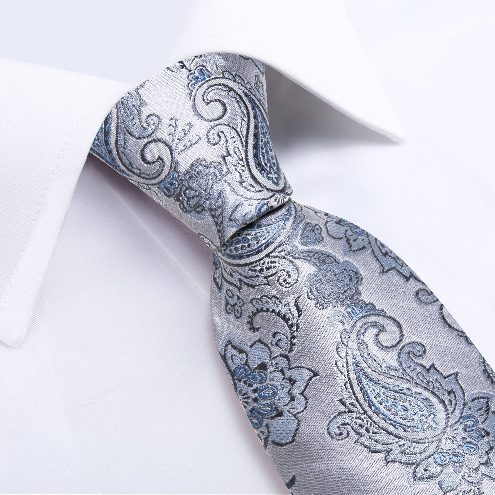 Dapper Essentials offers a meticulously crafted tie made from pure woven silk, featuring an elegant paisley design in shades of silver, grey, and blue.