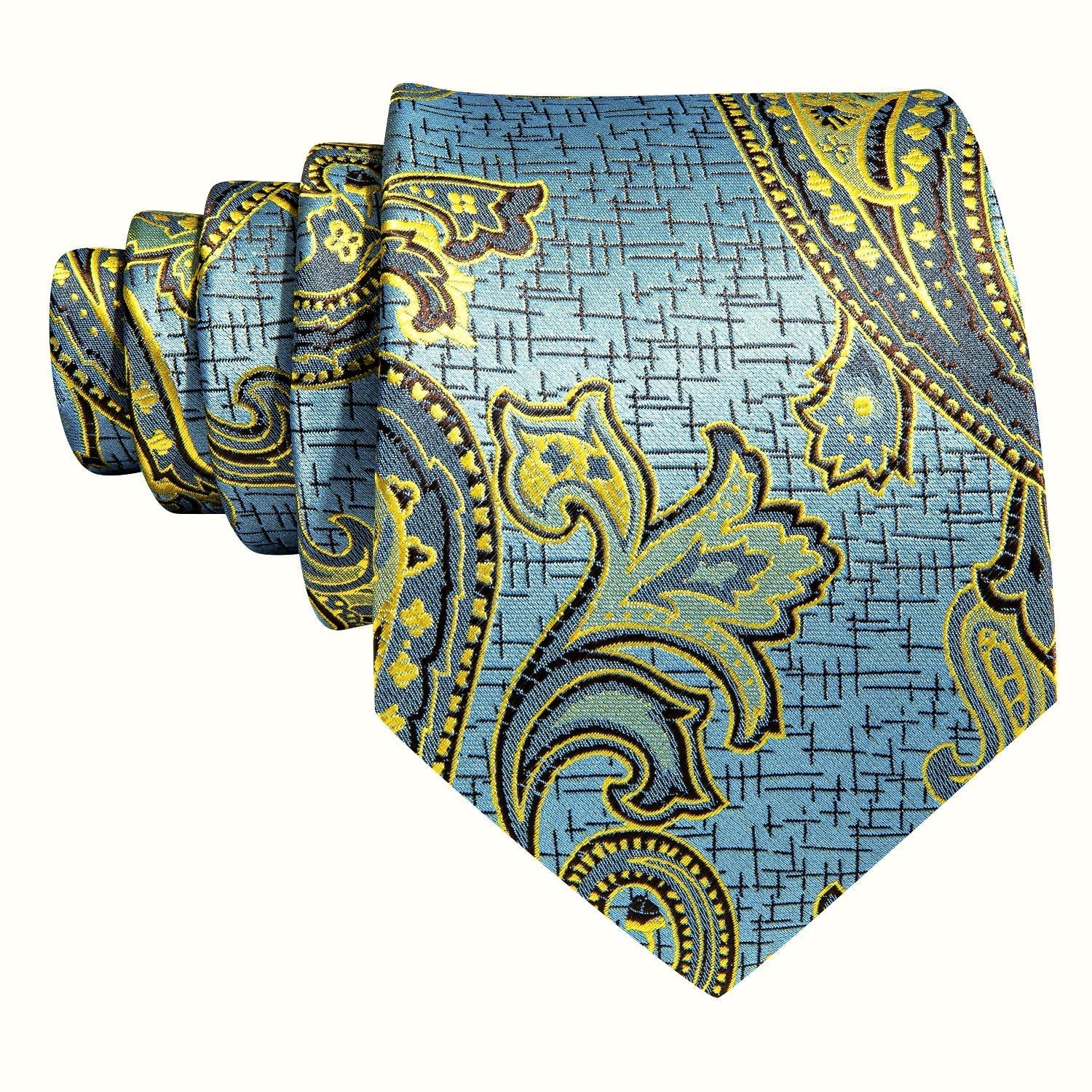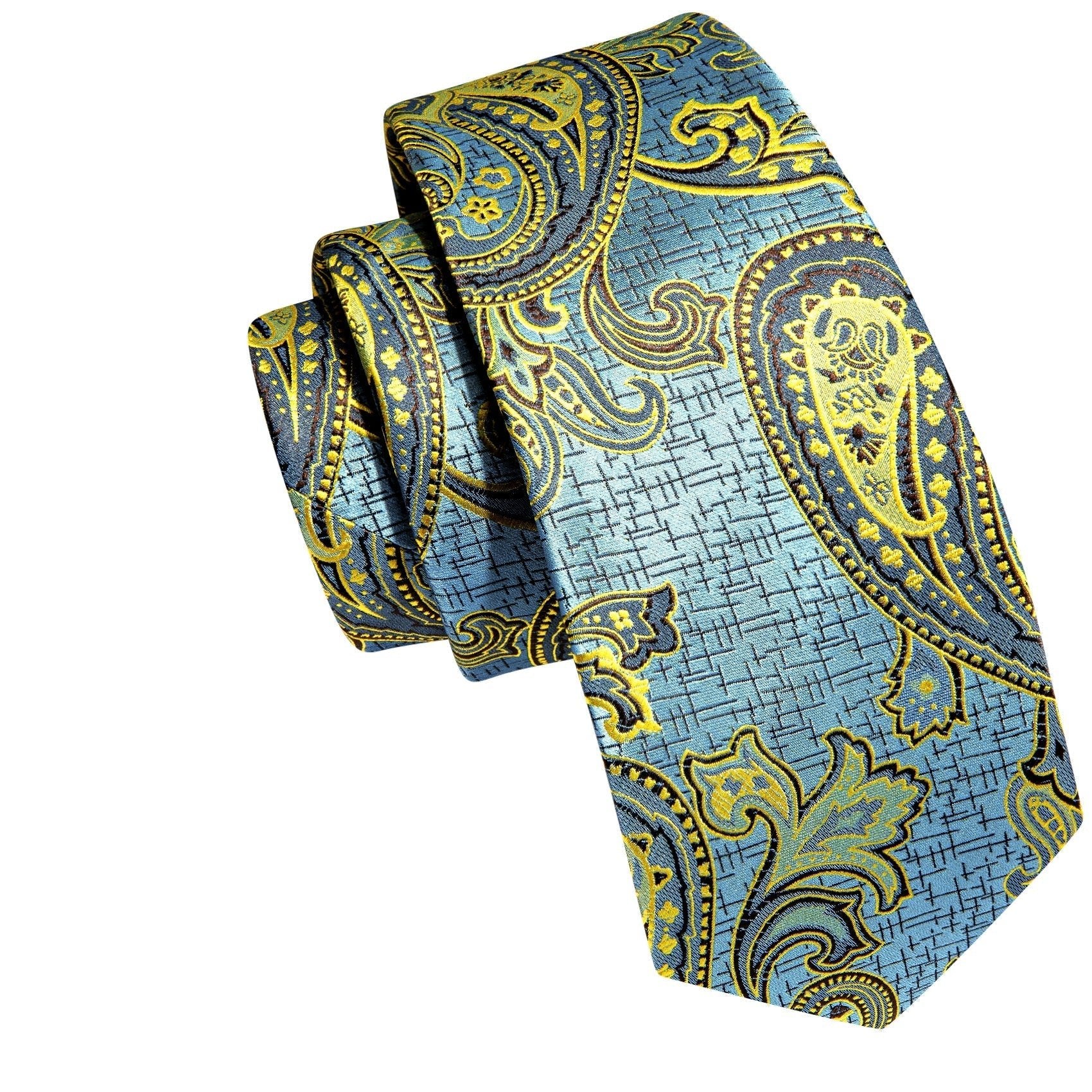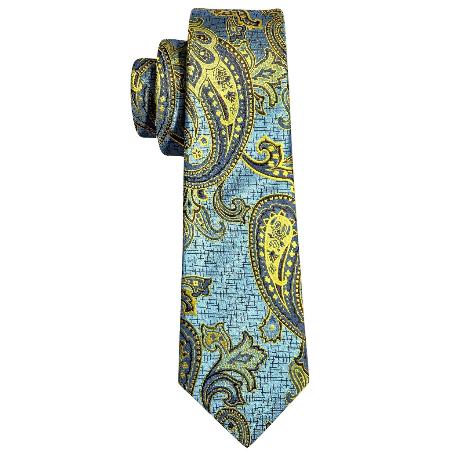 Dapper Essentials presents a meticulously designed tie crafted entirely from woven silk, featuring a refined turquoise paisley pattern in shades of gold, blue, and black.