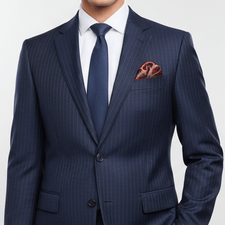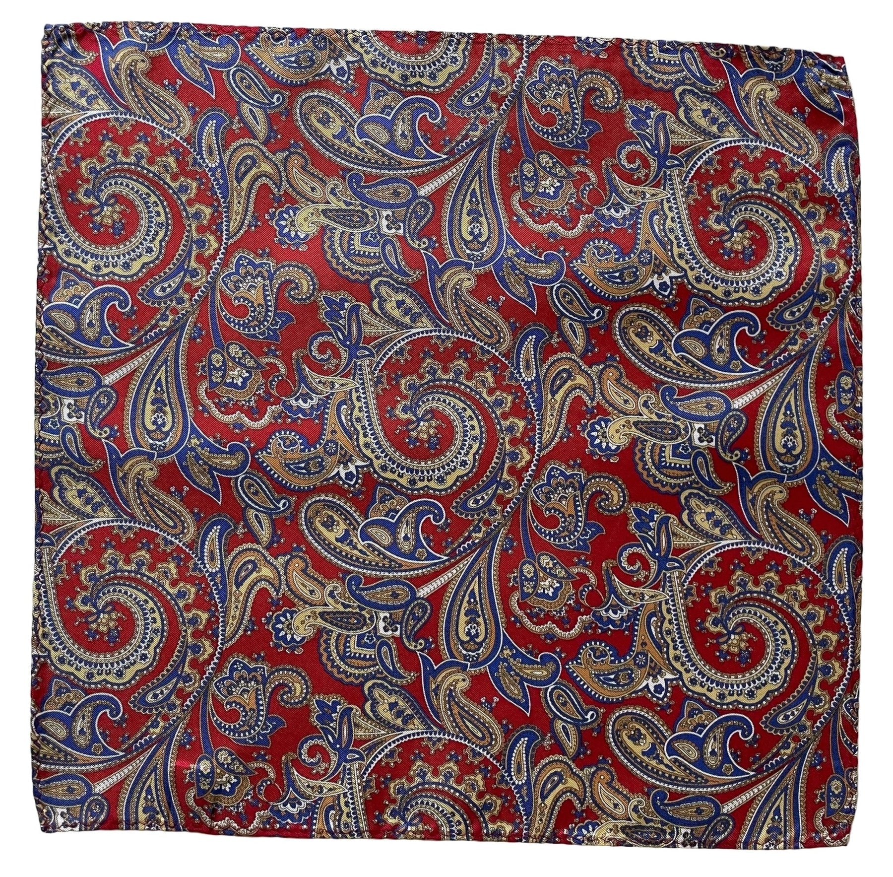 This pocket square showcases a richly patterned paisley design arranged in a square format, bordered by a slim, solid edge. Its symmetrical and seamless layout is filled with closely set motifs, creating an intricate and lively appearance.