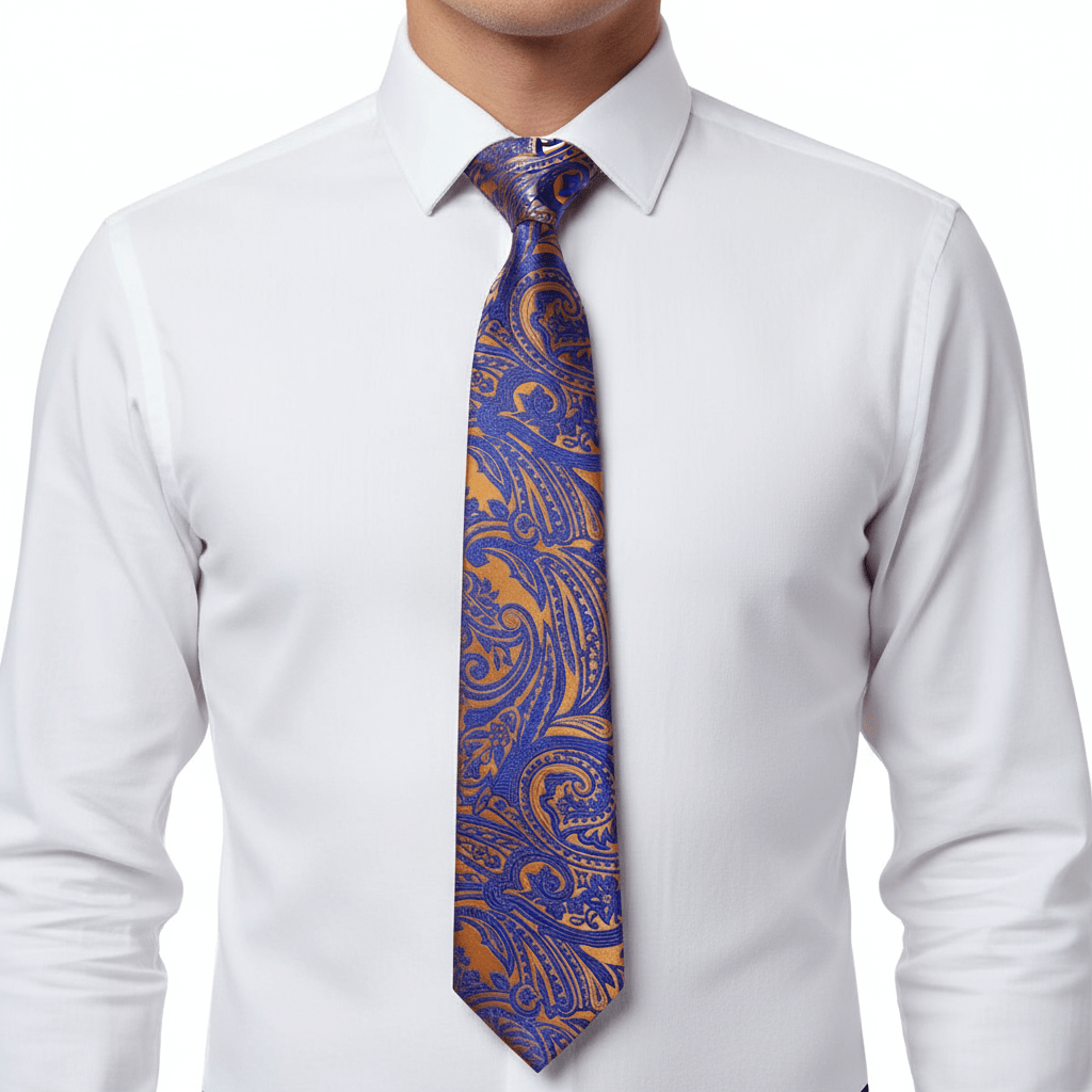 The stunning paisley pattern in shades of blue and orange adds a pop of colour to any outfit, making it the perfect accessory for formal events or special occasions. The timeless design of this luxury neck tie will elevate your style and make a statement wherever you go. Whether paired with a suit for a business meeting or worn with a dress shirt for a wedding, this tie is sure to impress.