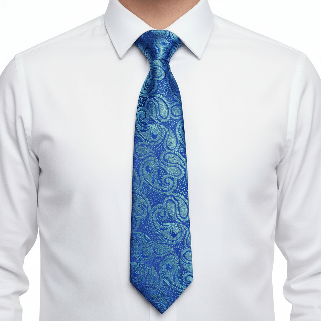 Dapper Essentials presents an expertly made silk tie showcasing an elegant paisley pattern in light and dark blue hues.