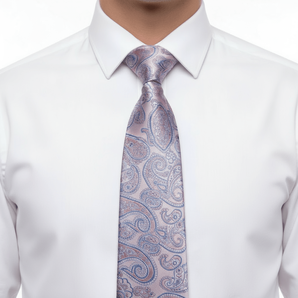 Dapper Essentials offers a finely crafted silk tie featuring a sophisticated paisley design in shades of lavender grey, light blue, and dusty mauve.