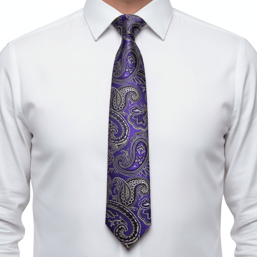 Dapper Essentials presents an expertly made silk tie showcasing an elegant paisley pattern in dark purple, beige, and black.