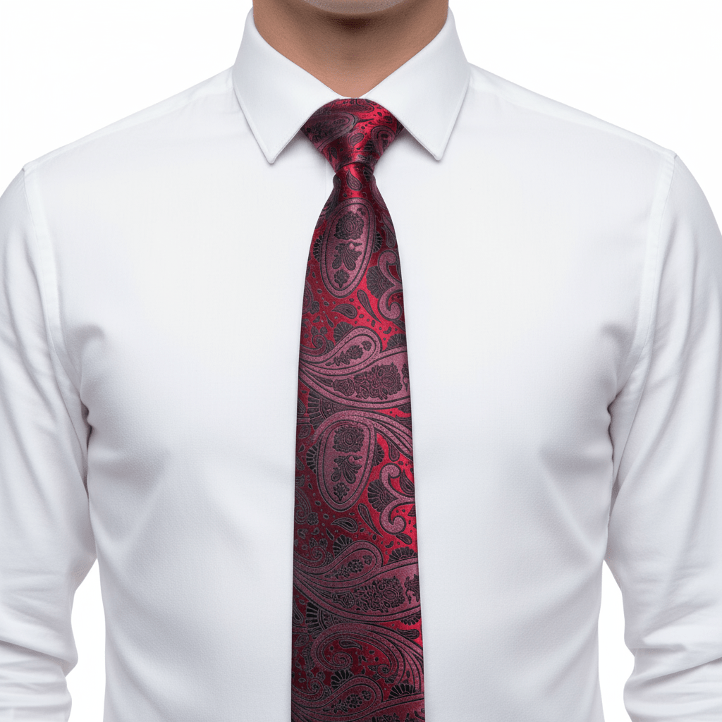 Dapper Essentials presents an expertly woven silk tie showcasing an elegant paisley pattern in shades of dark red, light red, and black.