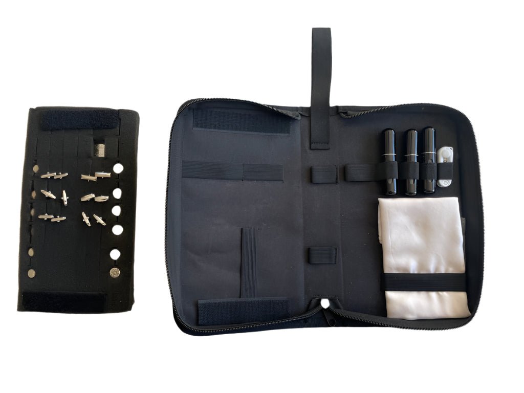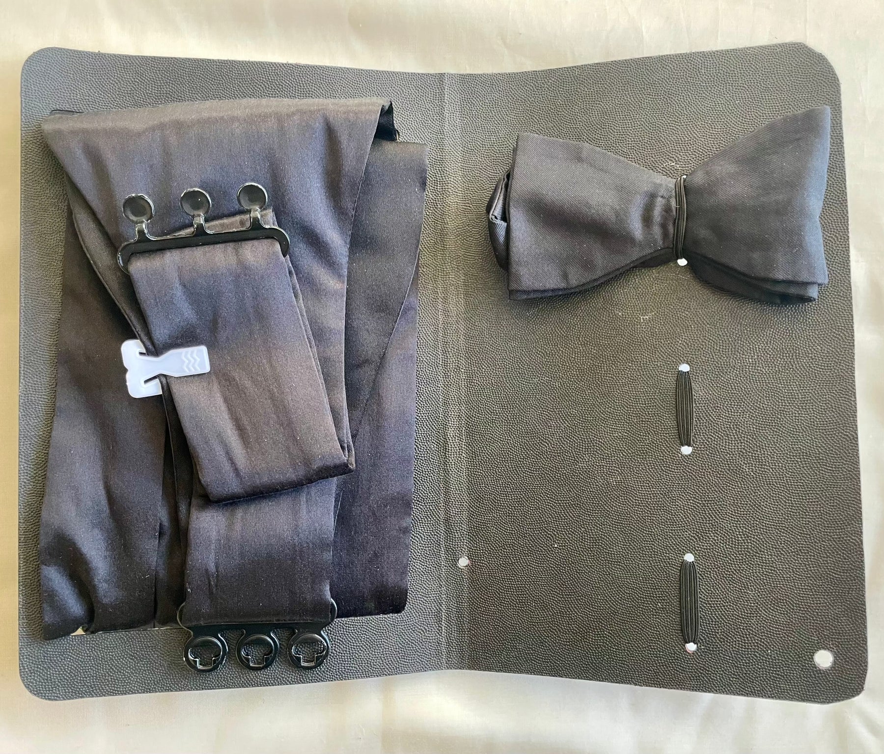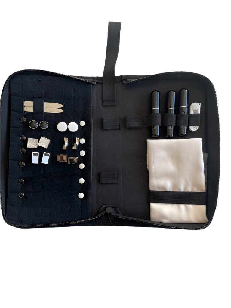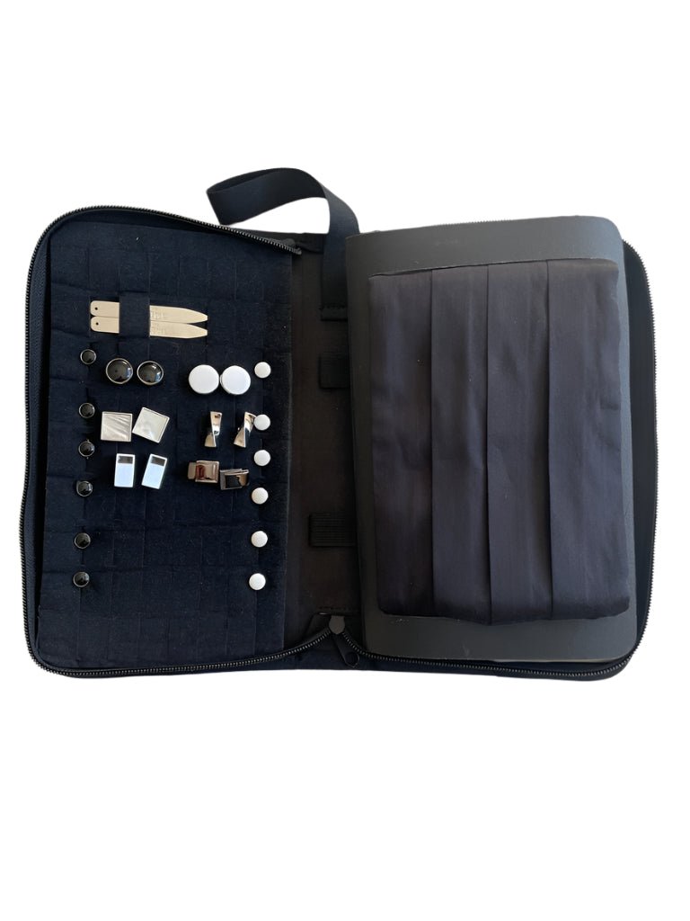 This is the Dapper Essentials black tie accessories wallet. Designed specifically to keep all your cufflinks, studs, cummerbund, bowties, pocket squares and atomisers all in an organised case. Now you never have to worry about losing your dapper accessories since they're all nicely stored in this purpose made wallet. Just don't forget to pack this in your luggage when attending those black-tie events.
