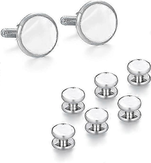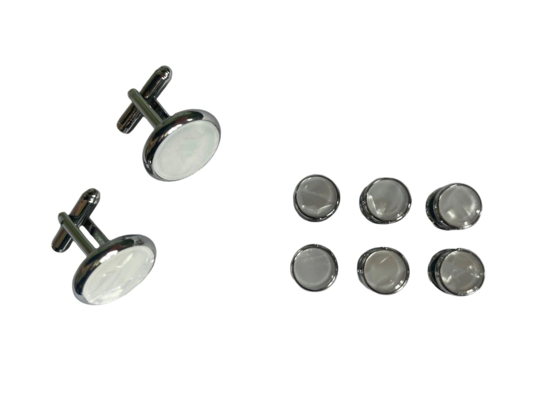 8 pieces come as a set - 1 pair circular cufflinks and 3 pairs of round shirt studs all with mother of pearl surrounds