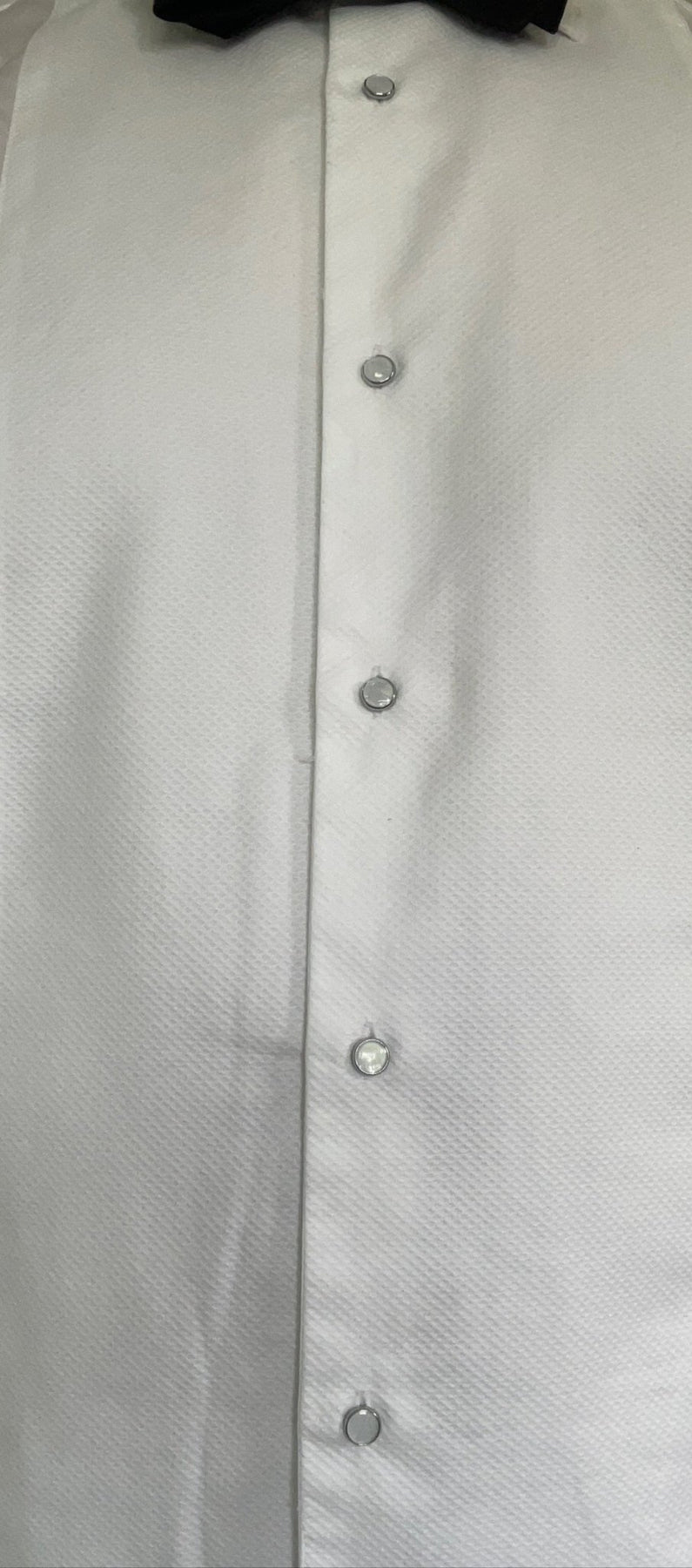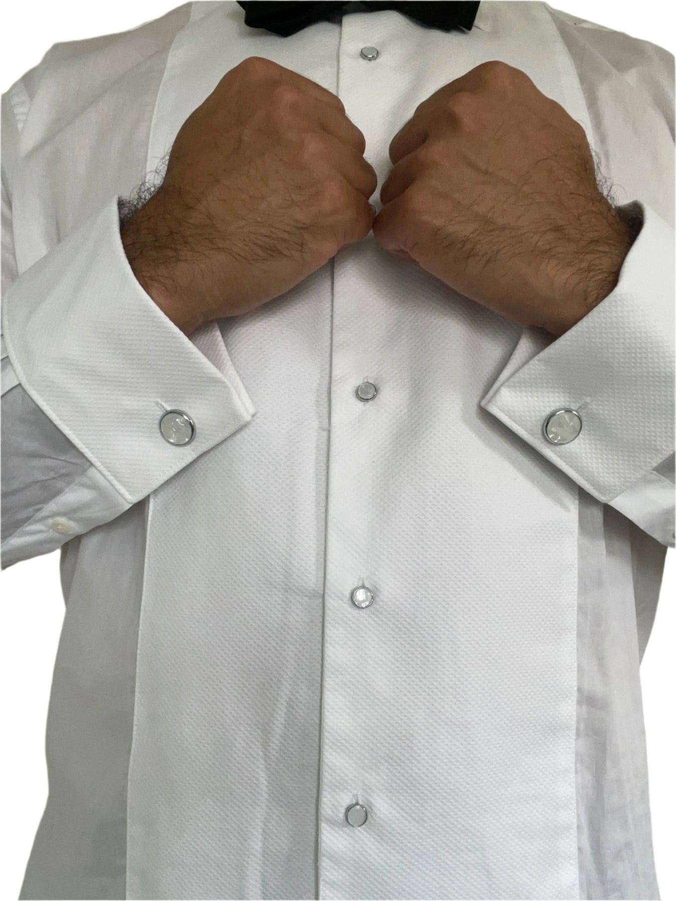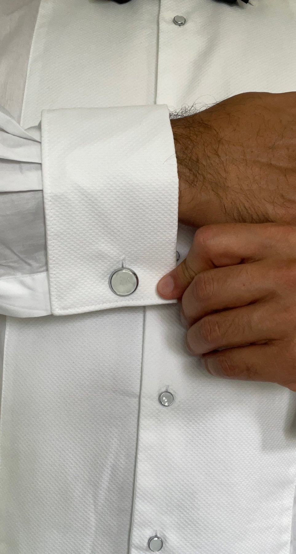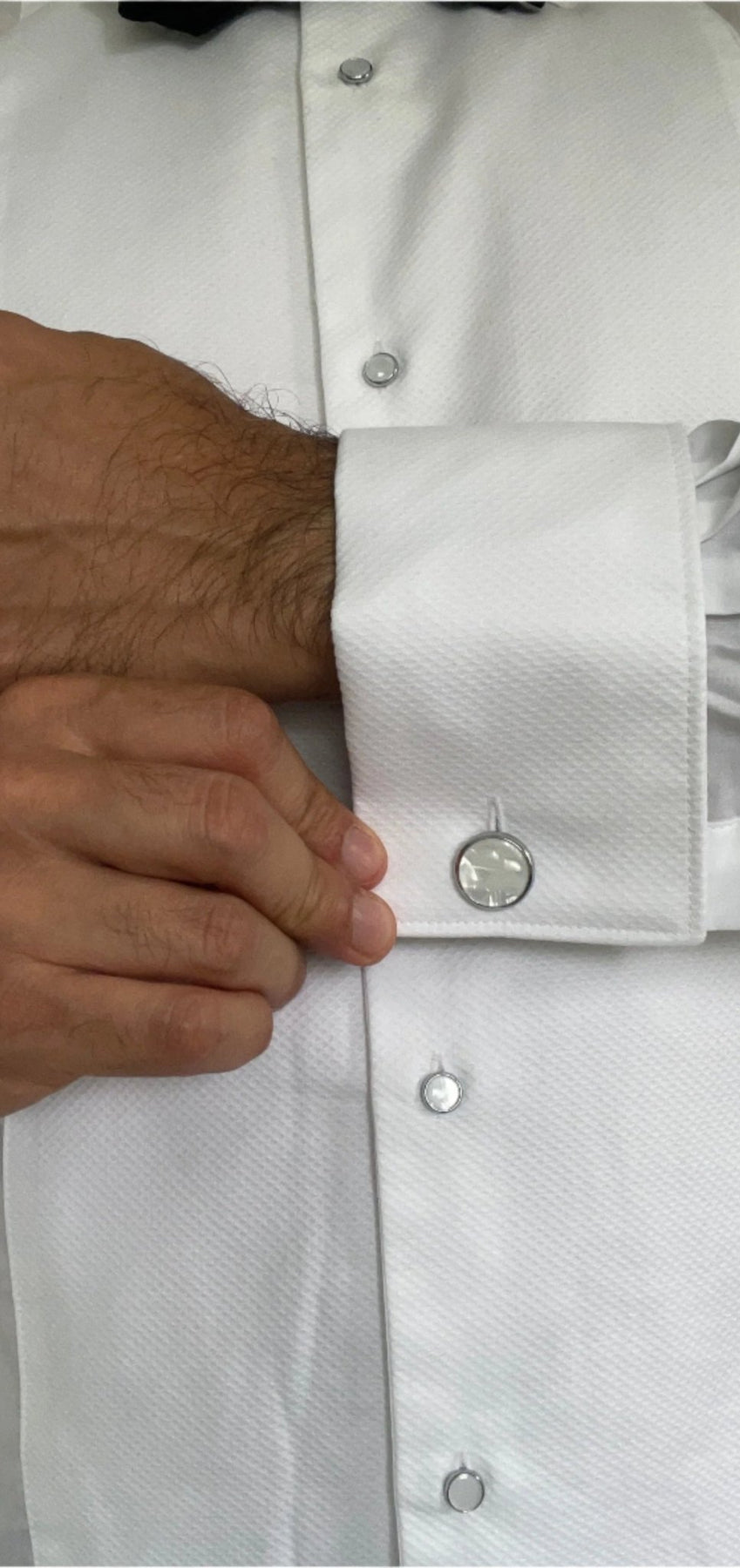 Elevate your formal attire with this exquisite set of black-tie shirt studs and matching cufflinks, meticulously crafted from luxurious white mother of pearl. The natural iridescence of the nacre adds a refined sheen that complements tuxedos and dress shirts with subtle elegance.