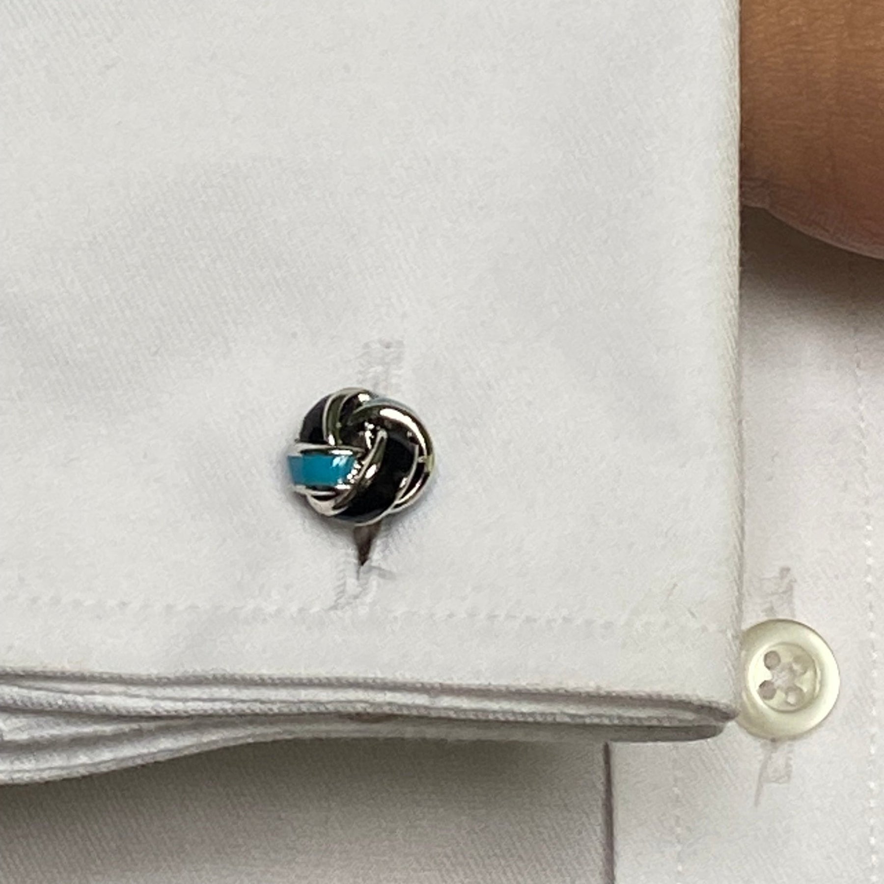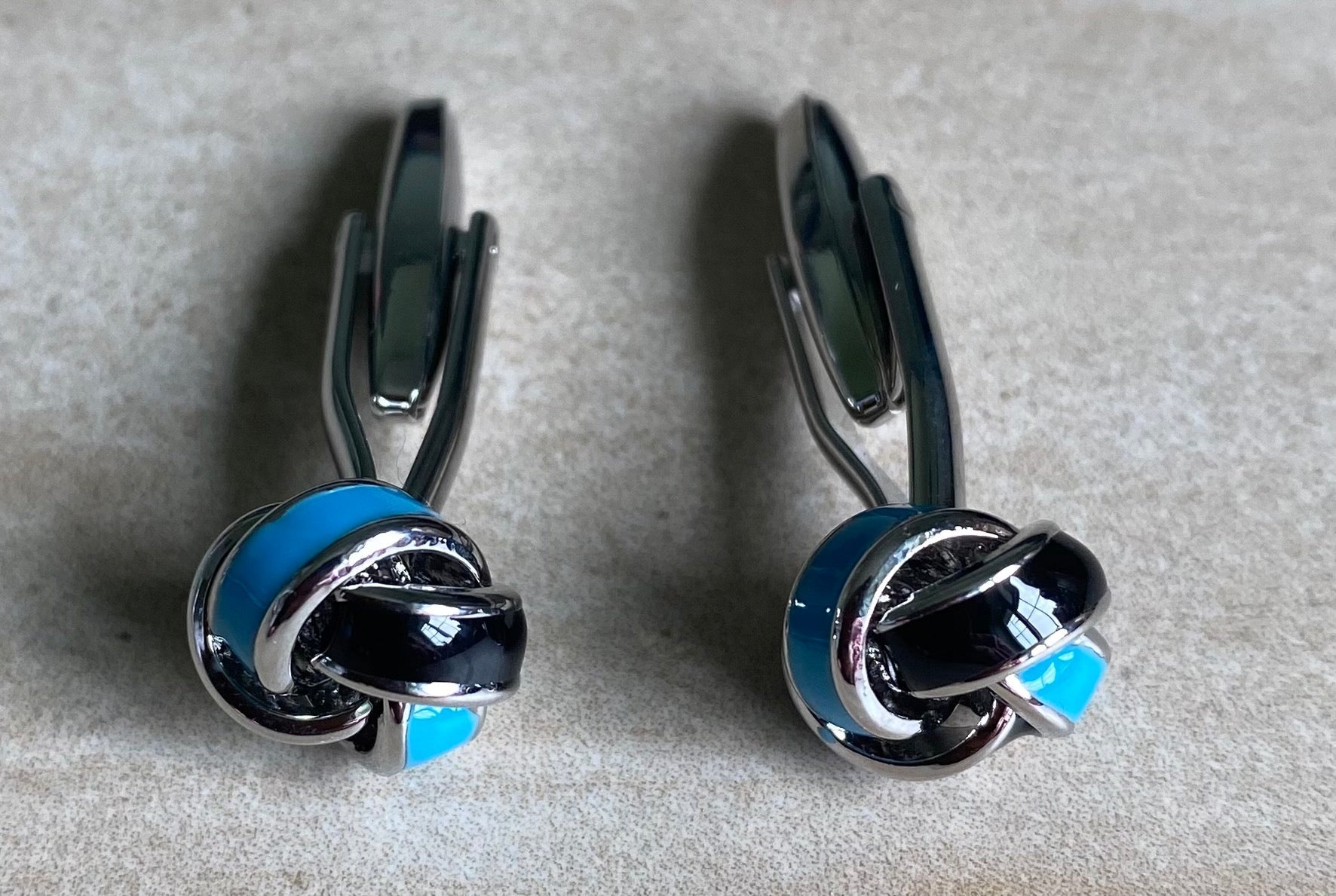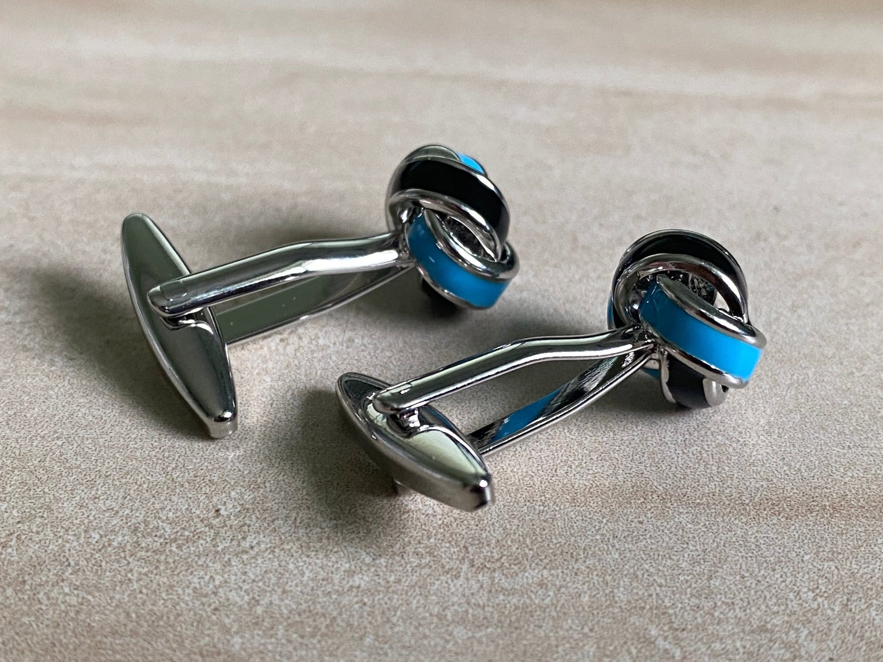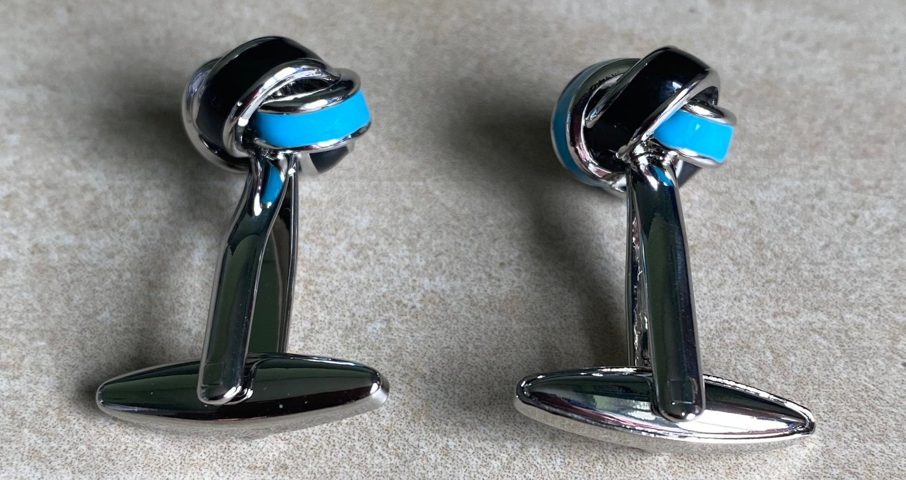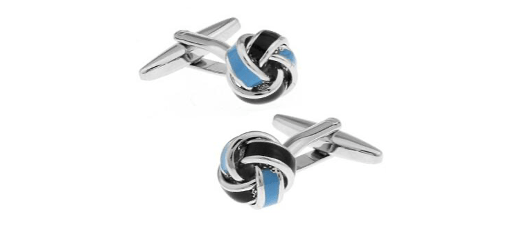 These classic blue and black two colour knot cufflinks add a touch of class and elegance. Made with high quality material, and fine polish finish that will elevate your every day style.