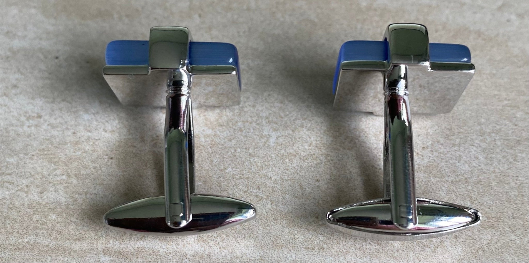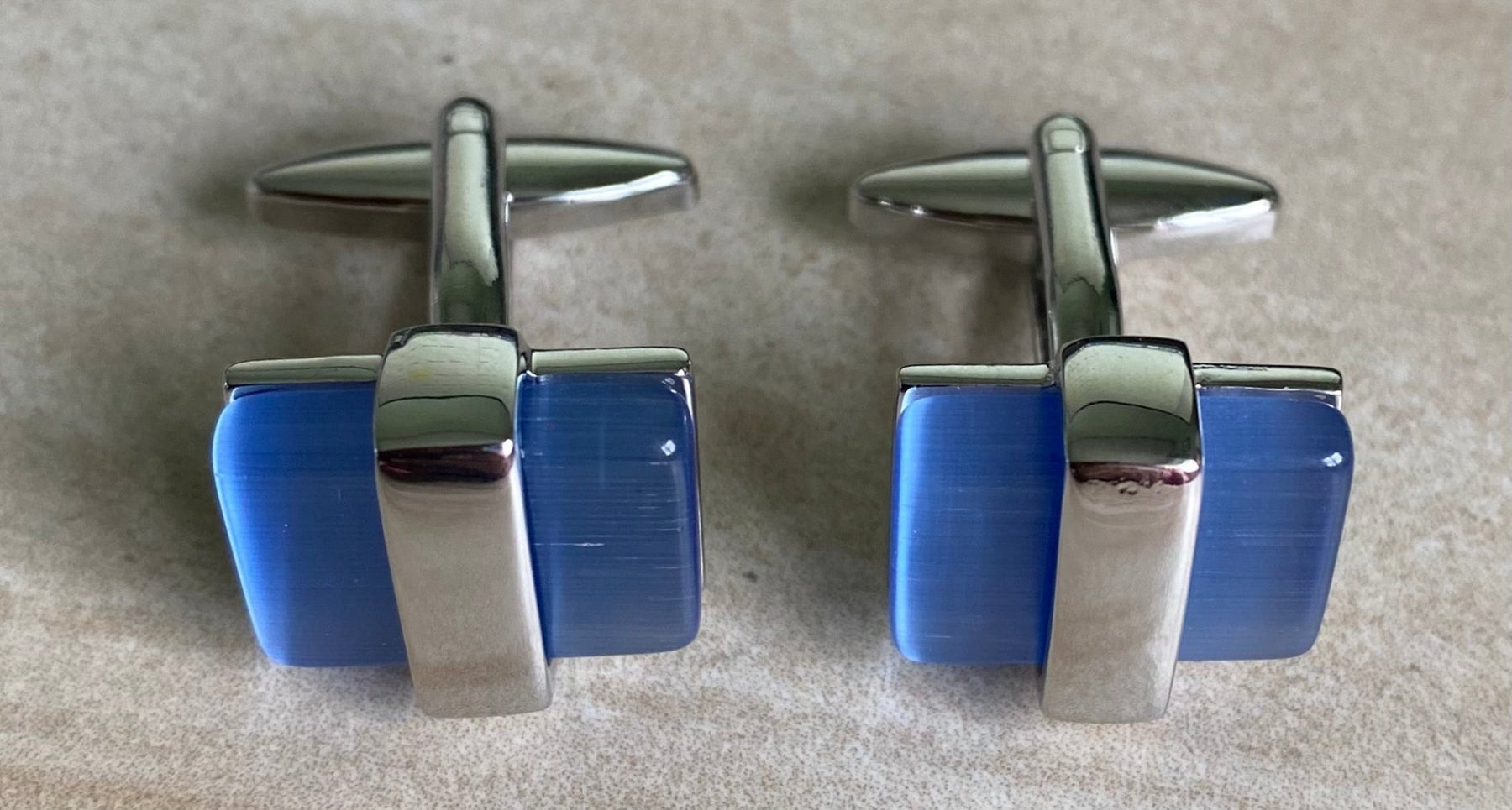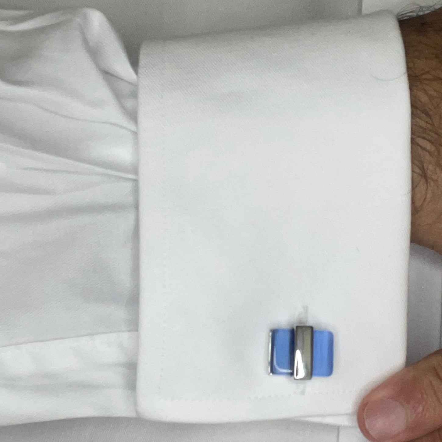 These blue cateye stone cufflinks crafted from solid brass add a touch of elegance to your attire. Each meticulously crafted cufflink showcases an enchanting smooth blue stone that radiates elegance and sophistication. The sleek silver setting enhances the stone's beauty, allowing it to sparkle and catch the light with every movement. Whether worn to a formal event or a special occasion, these cufflinks add a vibrant touch of refinement to any ensemble.