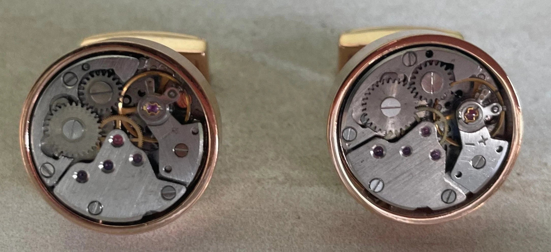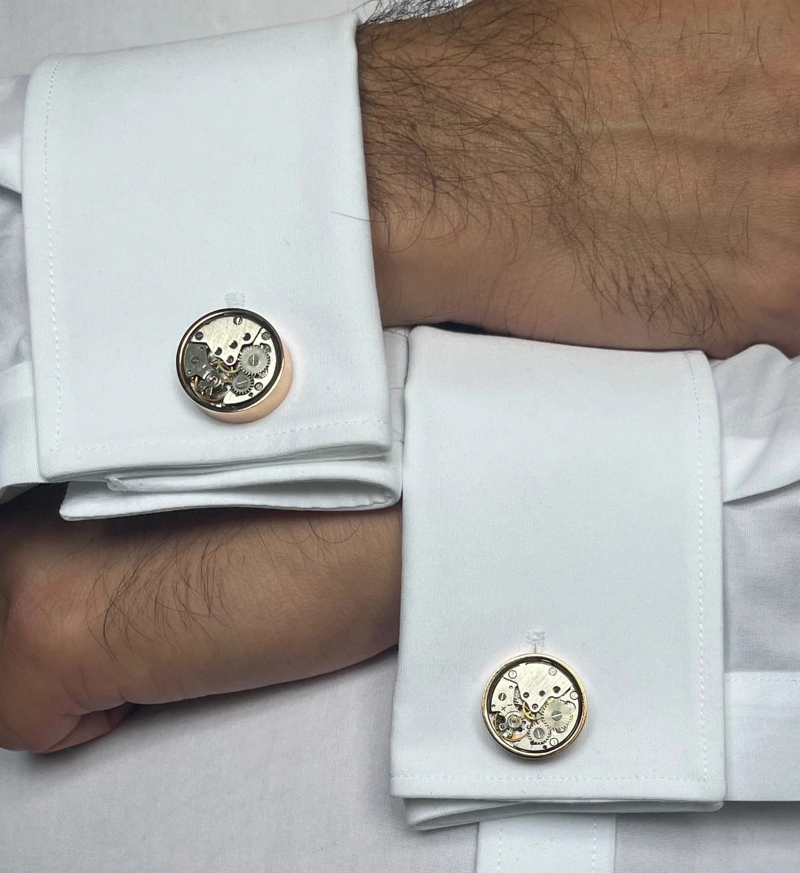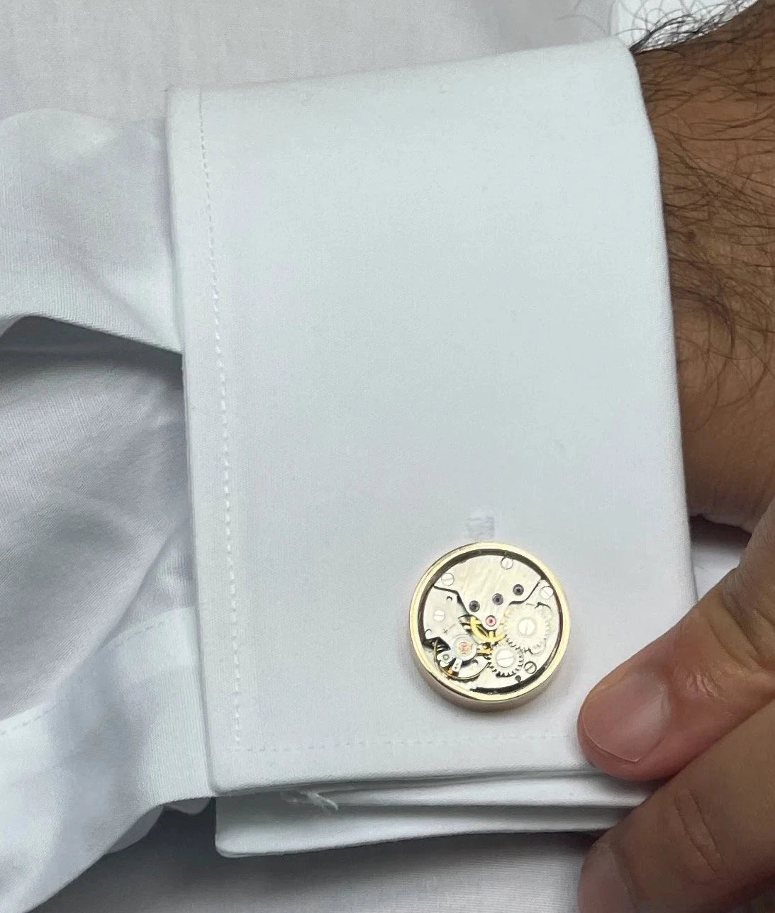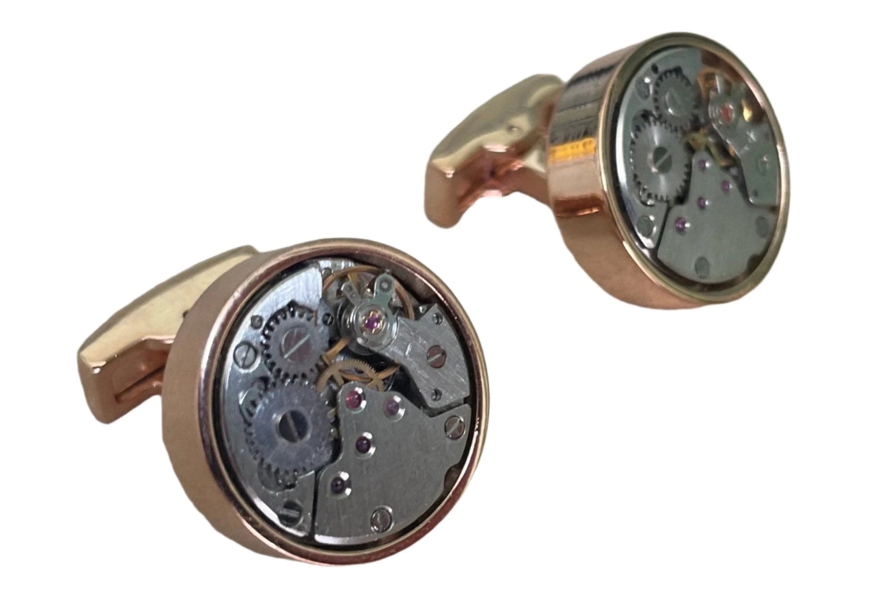 Elevate your style with our Brass encased Steampunk cufflinks. These exclusive accessories feature circular watch movements encased in a luxurious brass surround. Showcasing intricate details and exquisite craftsmanship, they add a touch of sophistication to any outfit. Upgrade your look and make a statement with these timeless cufflinks.